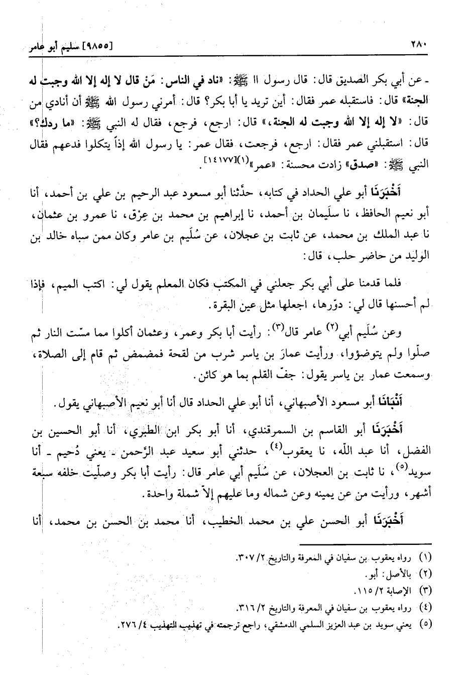أخبرنا أبو علي الحداد في كتابه، حدّثنا أبو مسعود عبد الرحيم بن علي بن أحمد، أنا أبو نعيم الحافظ، نا سليمان بن أحمد، نا إبراهيم بن محمد بن عرق، نا عمرو بن عثمان، نا عبد الملك بن محمد، عن ثابت بن عجلان، عن سليم بن عامر وكان ممن سباه خالد بن الوليد من حاضر حلب، قال: