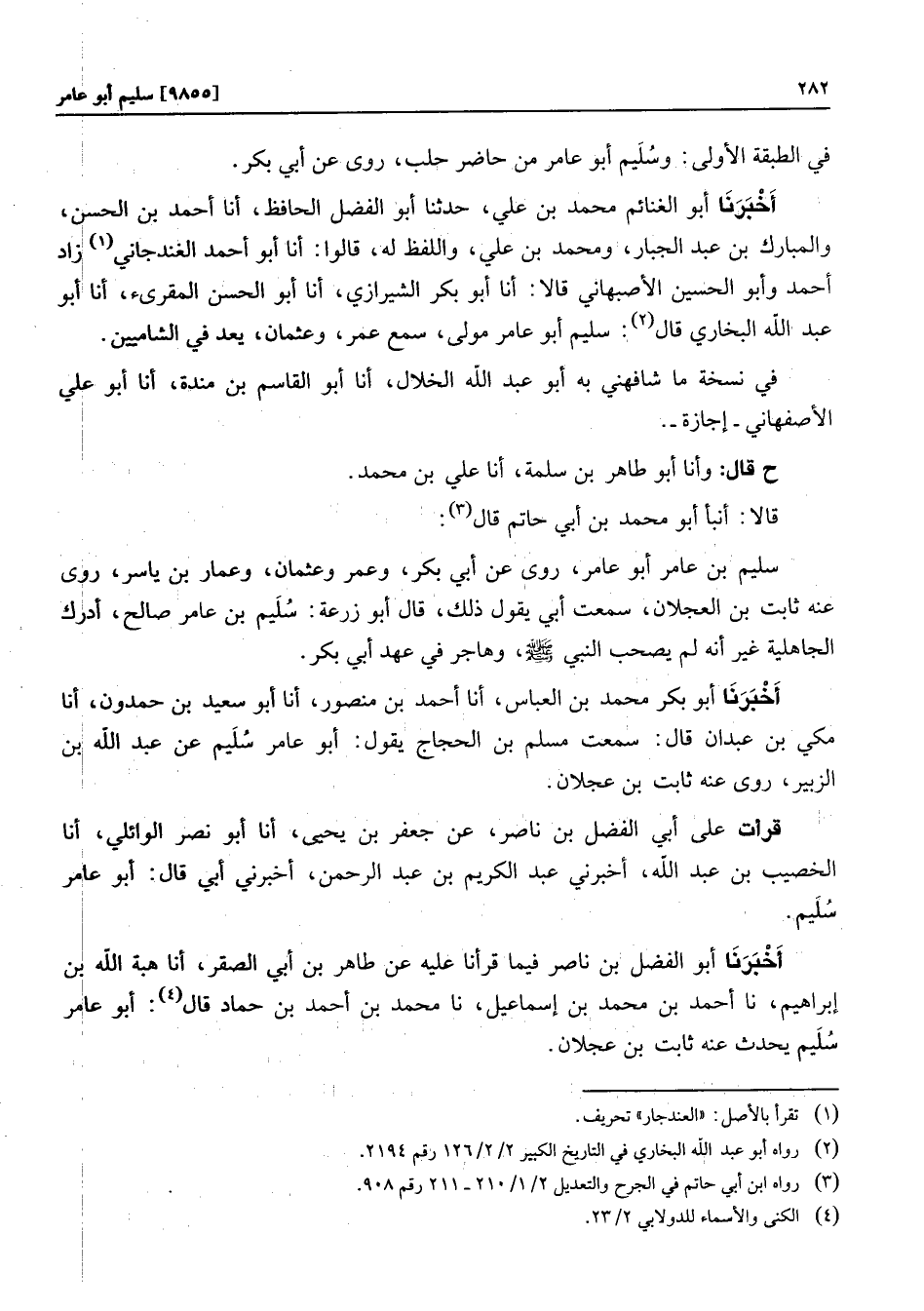 أخبرنا أبو بكر محمد بن العباس، أنا أحمد بن منصور، أنا أبو سعيد بن حمدون، أنا مكي بن عبدان قال: سمعت مسلم بن الحجاج يقول: أبو عامر سليم عن عبد الله بن الزبير، روى عنه ثابت بن عجلان.