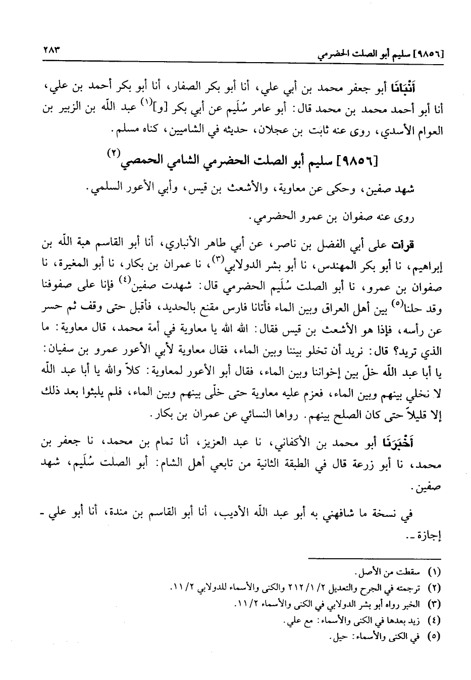 أخبرنا أبو محمد بن الأكفاني، نا عبد العزيز، أنا تمام بن محمد، نا جعفر بن محمد، نا أبو زرعة قال في الطبقة الثانية من تابعي أهل الشام: أبو الصلت سليم، شهد صفين.