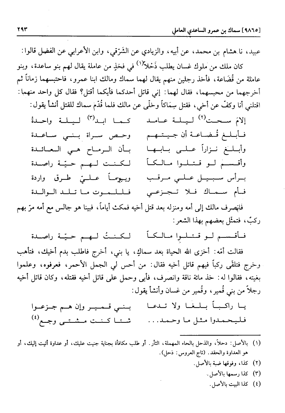 كان ملك من ملوك غسان يطلب ذحلا «1» في فخذ من عاملة يقال لهم بنو ساعدة، وبنو عاملة من قضاعة، فأخذ رجلين منهم يقال لهما سماك ومالك ابنا عمرو، فاحتبسهما زمانا ثم أخرجهما من محبسهما، فقال لهما: إني قاتل أحدكما فأيكما أقتل؟ فقال كل واحد منهما: