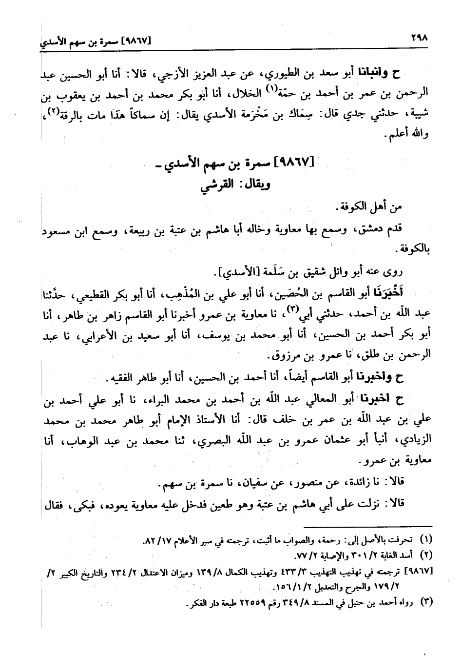 أخبرنا أبو القاسم بن الحصين، أنا أبو علي بن المذهب، أنا أبو بكر القطيعي، حدّثنا عبد الله بن أحمد، حدثني أبي «3» ، نا معاوية بن عمرو أخبرنا أبو القاسم زاهر بن طاهر، أنا أبو بكر أحمد بن الحسين، أنا أبو محمد بن يوسف، أنا أبو سعيد بن الأعرابي، نا عبد الرحمن بن طلق، نا عمرو بن مرزوق.