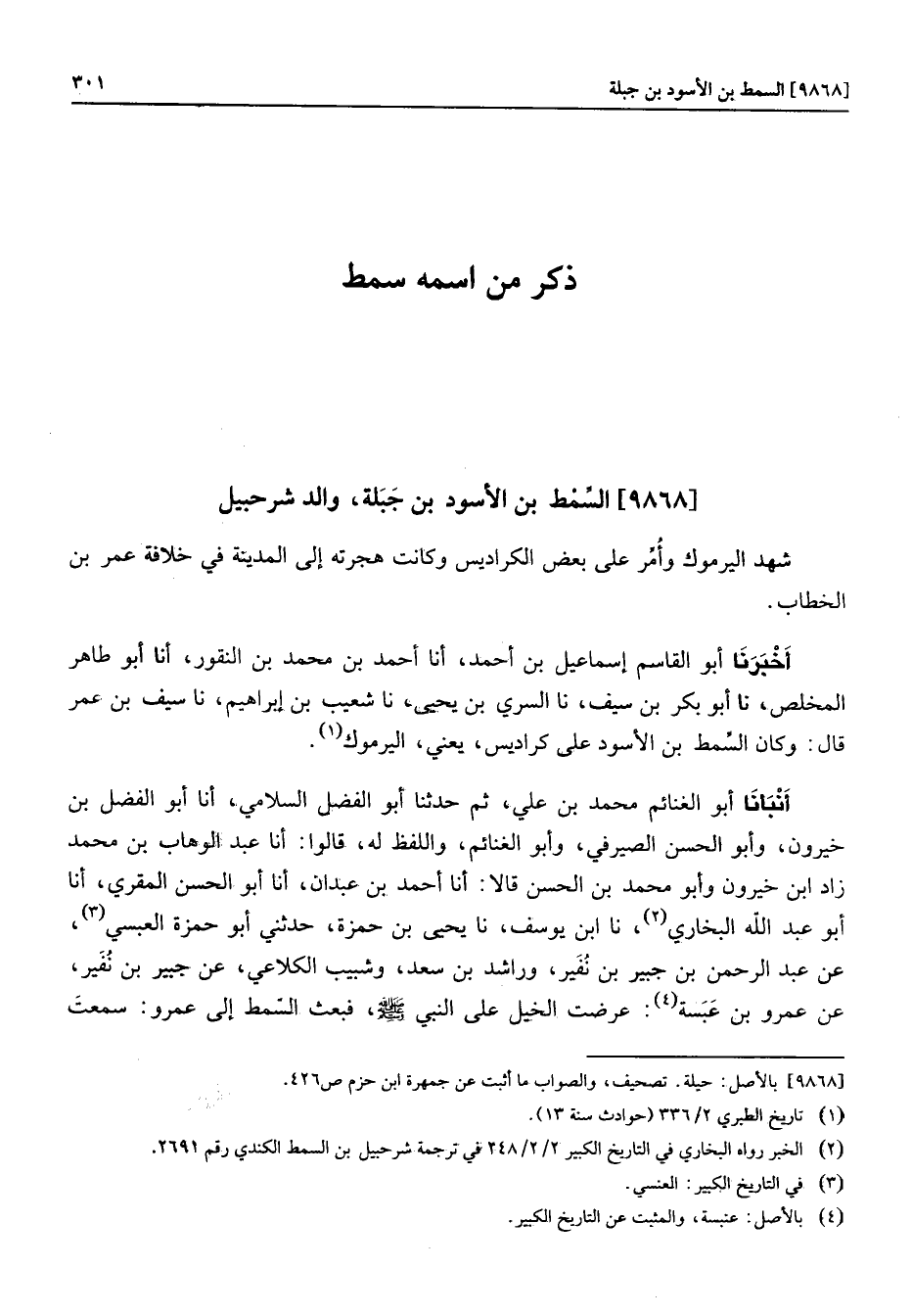 أخبرنا أبو القاسم إسماعيل بن أحمد، أنا أحمد بن محمد بن النقور، أنا أبو طاهر المخلص، نا أبو بكر بن سيف، نا السري بن يحيى، نا شعيب بن إبراهيم، نا سيف بن عمر قال: وكان السّمط بن الأسود على كراديس، يعني، اليرموك «1» . أنبأنا أبو الغنائم محمد بن علي، ثم حدثنا أبو الفضل السلامي، أنا أبو الفضل بن خيرون، وأبو الحسن الصيرفي، وأبو الغنائم، واللفظ له، قالوا: أنا عبد الوهاب بن محمد زاد ابن خيرون وأبو محمد بن الحسن قالا: أنا أحمد بن عبدان، أنا أبو الحسن المقري، أنا أبو عبد الله البخاري «2» ، نا ابن يوسف، نا يحيى بن حمزة، حدثني أبو حمزة العبسي «3» ، عن عبد الرحمن بن جبير بن نفير، وراشد بن سعد، وشبيب الكلاعي، عن جبير بن نفير، عن عمرو بن عبسة «4» : عرضت الخيل على النبي صلى الله عليه وسلم، فبعث السّمط إلى عمرو: سمعت