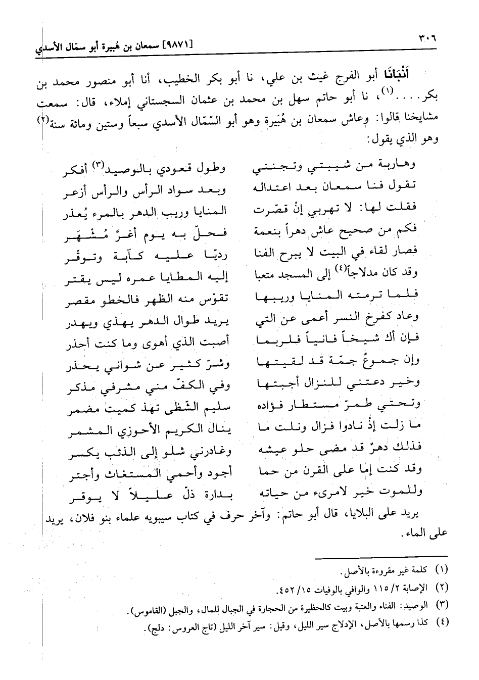 أنبأنا أبو الفرج غيث بن علي، نا أبو بكر الخطيب، أنا أبو منصور محمد بن بكر.... «1» ، نا أبو حاتم سهل بن محمد بن عثمان السجستاني إملاء، قال: سمعت مشايخنا قالوا: وعاش سمعان بن هبيرة وهو أبو السّمّال الأسدي سبعا وستين ومائة سنة «2» وهو الذي يقول: