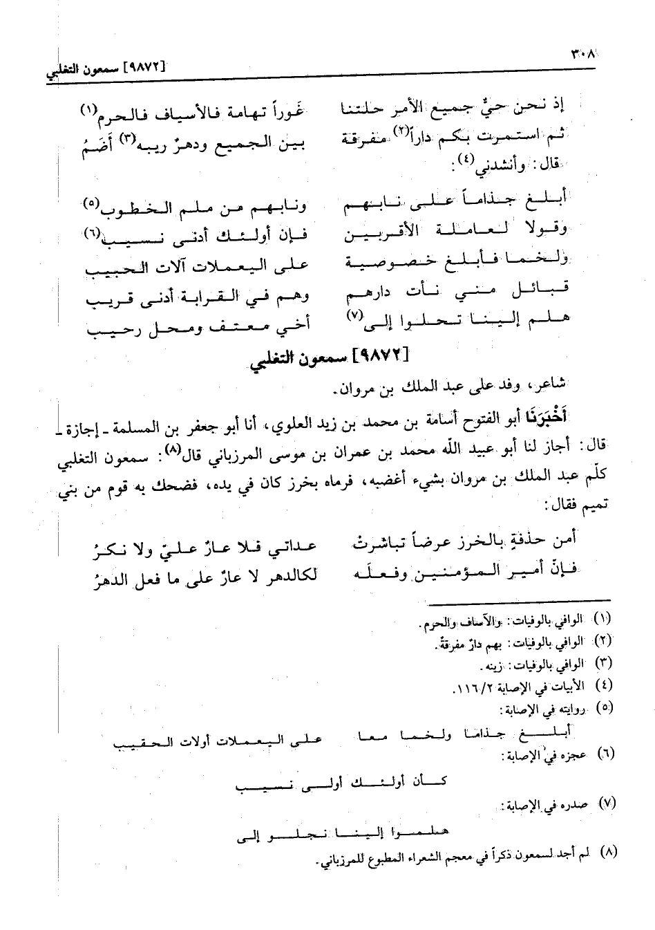 أخبرنا أبو الفتوح أسامة بن محمد بن زيد العلوي، أنا أبو جعفر بن المسلمة- إجازة- قال: أجاز لنا أبو عبيد الله محمد بن عمران بن موسى المرزباني قال «8» : سمعون التغلبي كلّم عبد الملك بن مروان بشيء أغضبه، فرماه بخرز كان في يده، فضحك به قوم من بني تميم فقال: