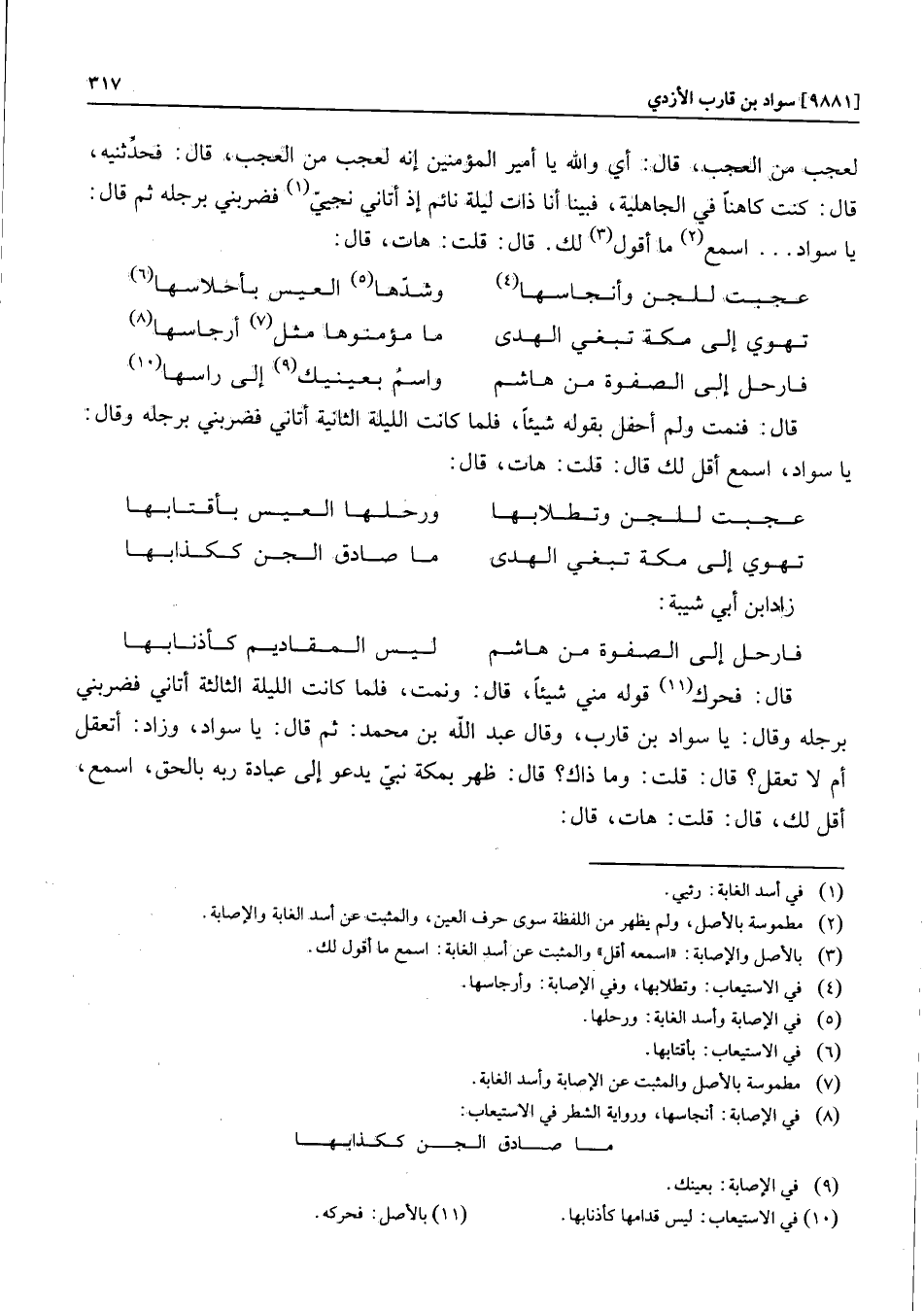 قال: فحرك «11» قوله مني شيئا، قال: ونمت، فلما كانت الليلة الثالثة أتاني فضربني برجله وقال: يا سواد بن قارب، وقال عبد الله بن محمد: ثم قال: يا سواد، وزاد: أتعقل أم لا تعقل؟ قال: قلت: وما ذاك؟ قال: ظهر بمكة نبيّ يدعو إلى عبادة ربه بالحق، اسمع، أقل لك، قال: قلت: هات، قال:
