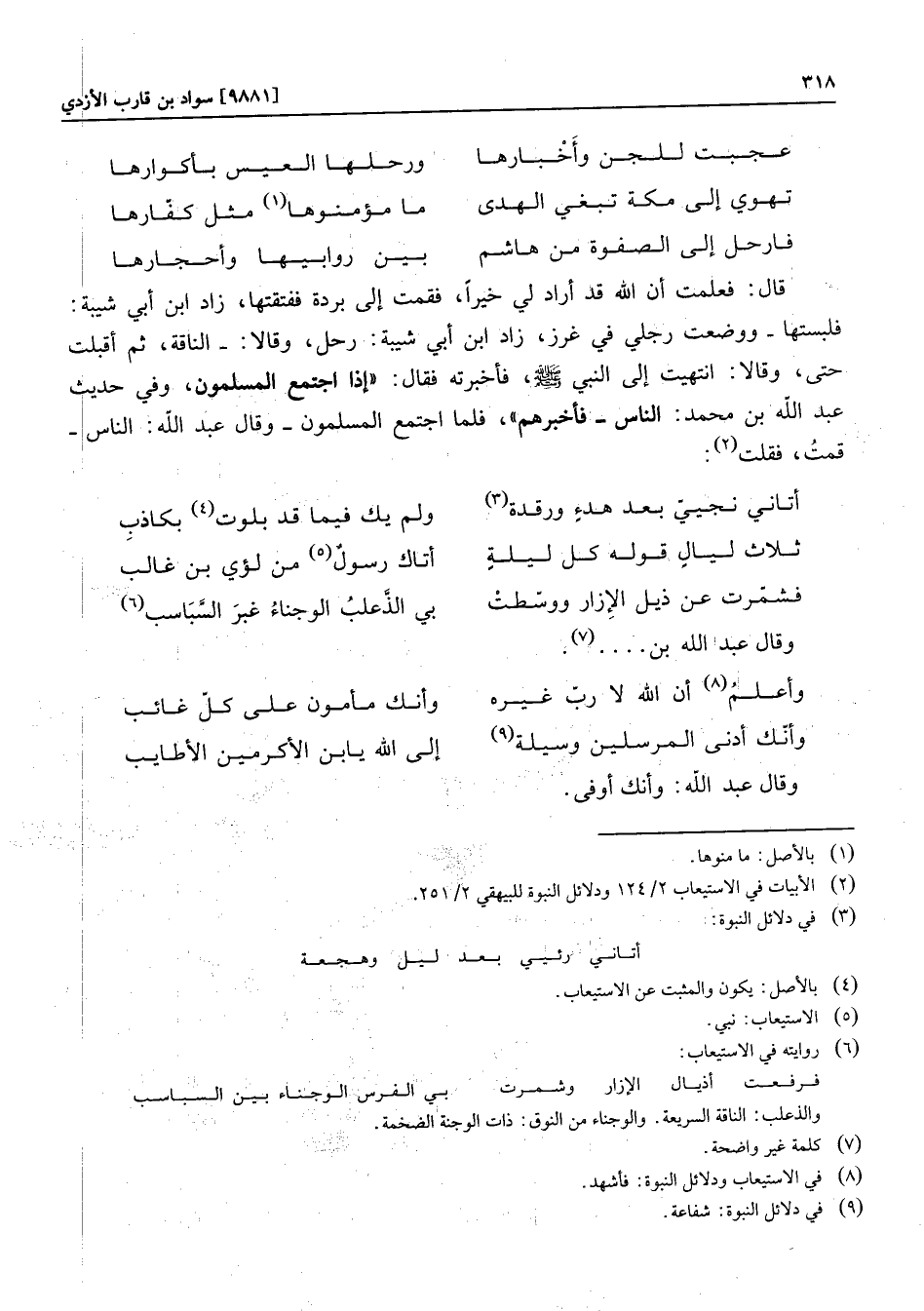 فلبستها- ووضعت رجلي في غرز، زاد ابن أبي شيبة: رحل، وقالا: - الناقة، ثم أقبلت حتى، وقالا: انتهيت إلى النبي صلى الله عليه وسلم، فأخبرته فقال: «إذا اجتمع المسلمون، وفي حديث عبد الله بن محمد: الناس- فأخبرهم» ، فلما اجتمع المسلمون- وقال عبد الله: الناس- قمت، فقلت «2» :