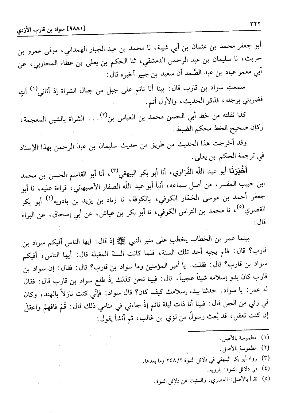 سمعت سواد بن قارب قال: بينا أنا نائم على جبل من جبال الشراة إذ أتاني «1» آت فضربني برجله، فذكر الحديث، والأول أتم.