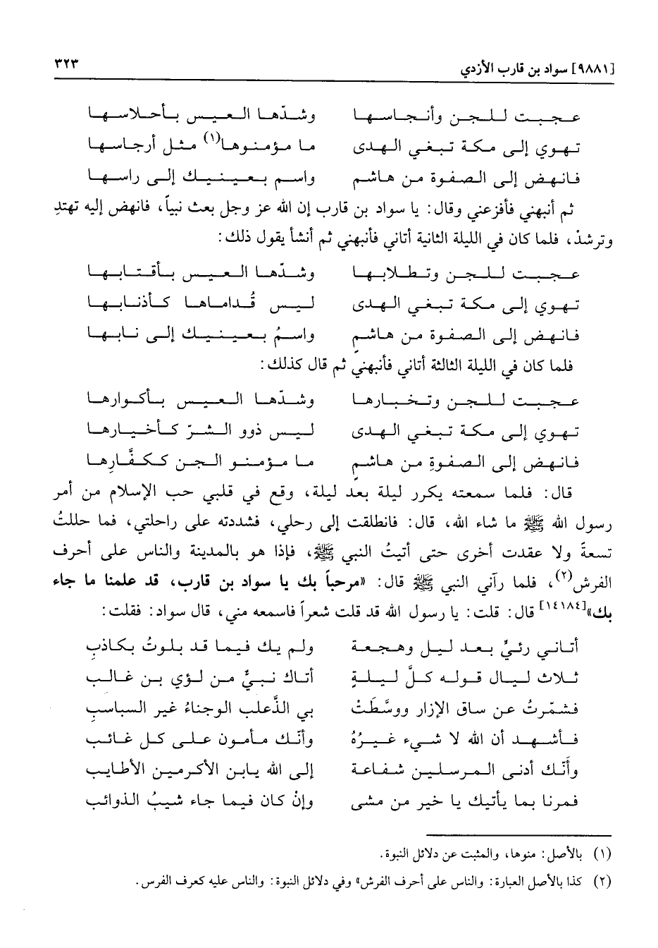 قال: فلما سمعته يكرر ليلة بعد ليلة، وقع في قلبي حب الإسلام من أمر رسول الله صلى الله عليه وسلم ما شاء الله، قال: فانطلقت إلى رحلي، فشددته على راحلتي، فما حللت تسعة ولا عقدت أخرى حتى أتيت النبي صلى الله عليه وسلم، فإذا هو بالمدينة والناس على أحرف الفرش «2» ، فلما رآني النبي صلى الله عليه وسلم قال: «مرحبا بك يا سواد بن قارب، قد علمنا ما جاء بك»