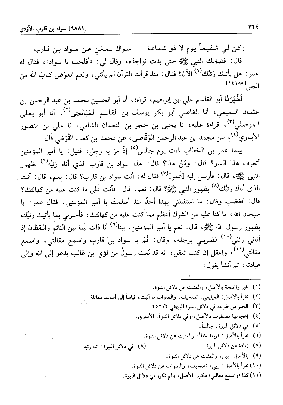 قال: فضحك النبي صلى الله عليه وسلم حتى بدت نواجذه، وقال لي: «أفلحت يا سواد» ، فقال له عمر: هل يأتيك رئيّك «1» الآن؟ فقال: منذ قرأت القرآن لم يأتني، ونعم العوض كتاب الله من الجن