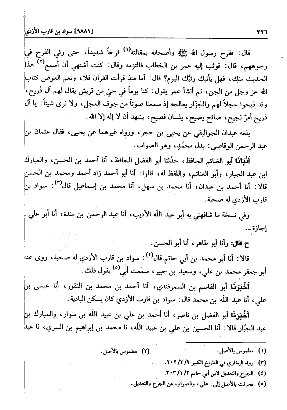 بلغه عبدان الجواليقي عن يحيى بن حجر، ورواه غيرهما عن يحيى، فقال عثمان بن عبد الرحمن الوقاصي: بدل محمّد، وهو الصواب. أنبأنا أبو الغنائم الحافظ، حدّثنا أبو الفضل الحافظ، أنا أحمد بن الحسن، والمبارك ابن عبد الجبار، وأبو الغنائم، واللفظ له، قالوا: أنا أبو أحمد زاد أحمد ومحمد بن الحسن قالا: أنا أحمد بن عبدان، أنا محمد بن سهل، أنا محمد بن إسماعيل قال «3» : سواد بن قارب الأزدي له صحبة.