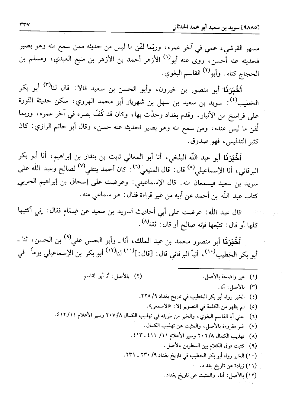 أخبرنا أبو منصور محمد بن عبد الملك، أنا- وأبو الحسن علي «9» بن الحسن، ثنا- أبو بكر الخطيب «10» ، أنبأ البرقاني قال: [قال:] «11» لنا «12» أبو بكر بن الإسماعيلي يوما: في