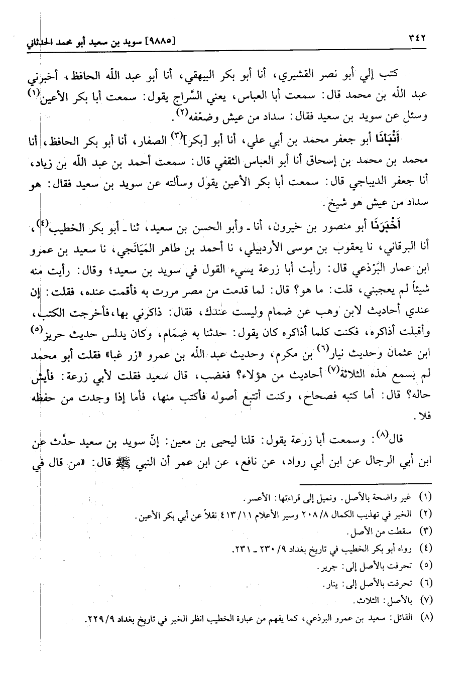 كتب إلي أبو نصر القشيري، أنا أبو بكر البيهقي، أنا أبو عبد الله الحافظ، أخبرني عبد الله بن محمد قال: سمعت أبا العباس، يعني السّراج يقول: سمعت أبا بكر الأعين «1» وسئل عن سويد بن سعيد فقال: سداد من عيش وضعّفه «2» .