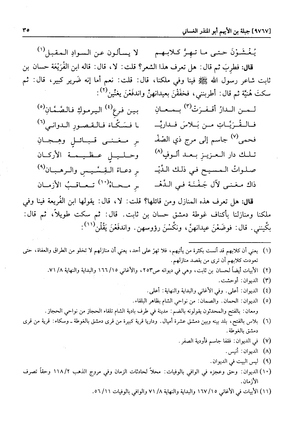 قال: هل تعرف هذه المنازل ومن قائلها؟ قلت: لا، قال: يقولها ابن الفريعة فينا وفي ملكنا ومنازلنا بأكناف غوطة دمشق حسان بن ثابت. قال: ثم سكت طويلا، ثم قال: