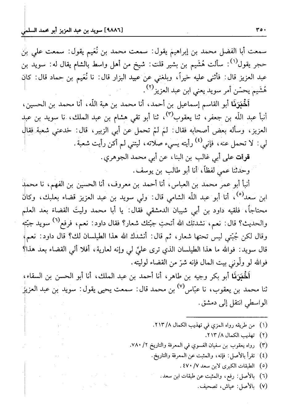 أخبرنا أبو بكر وجيه بن طاهر، أنا أحمد بن عبد الملك، أنا أبو الحسن بن السقاء، ثنا محمد بن يعقوب، نا عبّاس «7» بن محمد قال: سمعت يحيى يقول: سويد بن عبد العزيز الواسطي انتقل إلى دمشق.