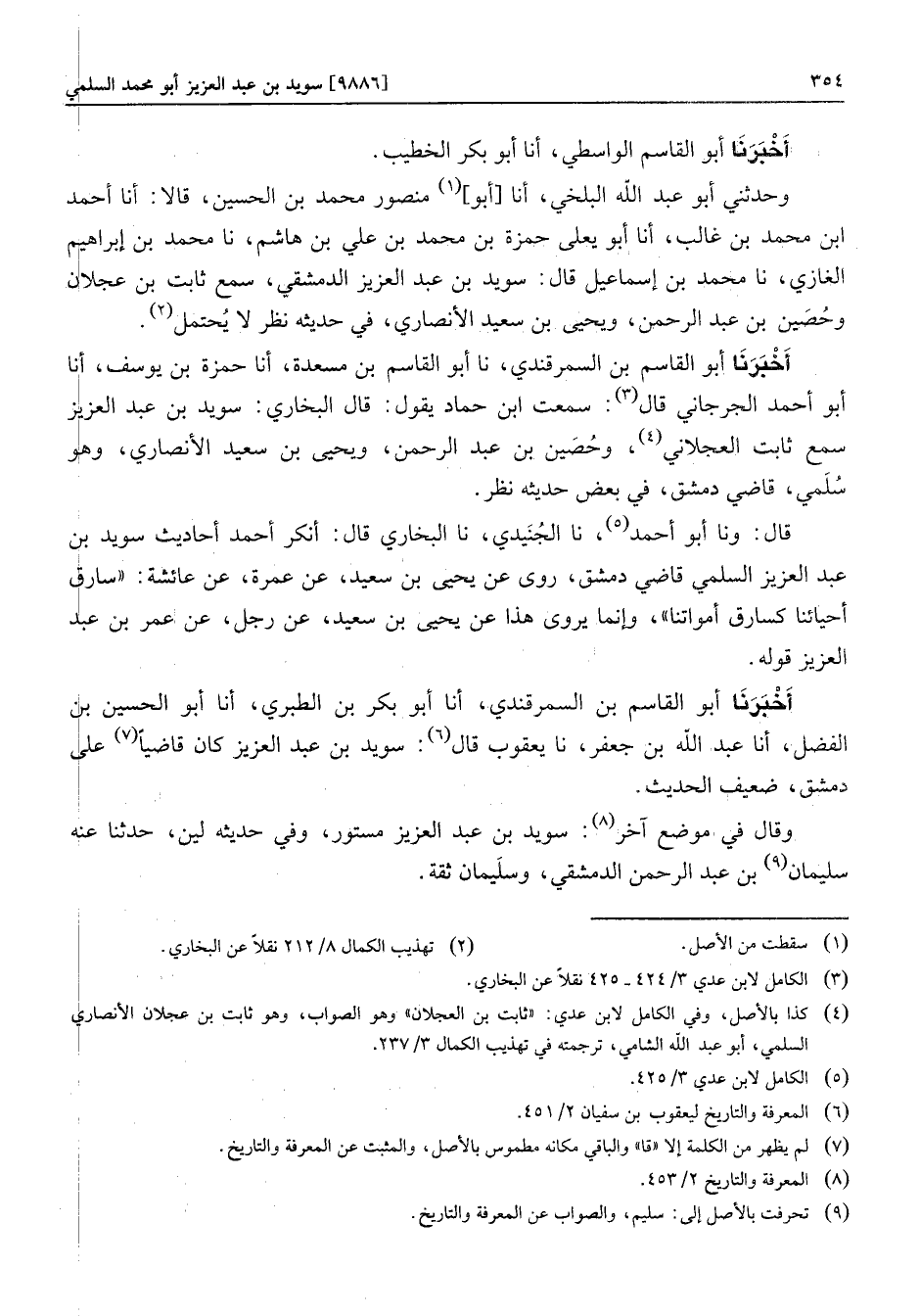وحدثني أبو عبد الله البلخي، أنا [أبو] «1» منصور محمد بن الحسين، قالا: أنا أحمد ابن محمد بن غالب، أنا أبو يعلى حمزة بن محمد بن علي بن هاشم، نا محمد بن إبراهيم الغازي، نا محمد بن إسماعيل قال: سويد بن عبد العزيز الدمشقي، سمع ثابت بن عجلان وحصين بن عبد الرحمن، ويحيى بن سعيد الأنصاري، في حديثه نظر لا يحتمل «2» . أخبرنا أبو القاسم بن السمرقندي، نا أبو القاسم بن مسعدة، أنا حمزة بن يوسف، أنا أبو أحمد الجرجاني قال «3» : سمعت ابن حماد يقول: قال البخاري: سويد بن عبد العزيز سمع ثابت العجلاني «4» ، وحصين بن عبد الرحمن، ويحيى بن سعيد الأنصاري، وهو سلمي، قاضي دمشق، في بعض حديثه نظر.