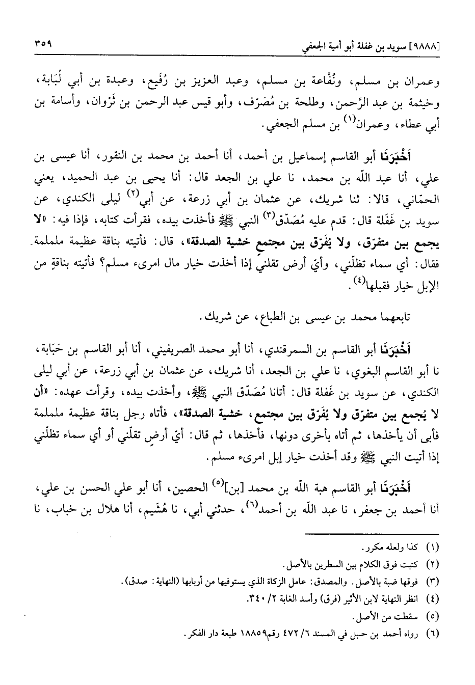 تابعهما محمد بن عيسى بن الطباع، عن شريك. أخبرنا أبو القاسم بن السمرقندي، أنا أبو محمد الصريفيني، أنا أبو القاسم بن حبابة، نا أبو القاسم البغوي، نا علي بن الجعد، أنا شريك، عن عثمان بن أبي زرعة، عن أبي ليلى الكندي، عن سويد بن غفلة قال: أتانا مصدّق النبي صلى الله عليه وسلم، وأخذت بيده، وقرأت عهده: «أن لا يجمع بين متفرّق ولا يفرّق بين مجتمع، خشية الصدقة» ، فأتاه رجل بناقة عظيمة ململمة فأبى أن يأخذها، ثم أتاه بأخرى دونها، فأخذها، ثم قال: أيّ أرض تقلّني أو أي سماء تظلّني إذا أتيت النبي صلى الله عليه وسلم وقد أخذت خيار إبل امرىء مسلم.