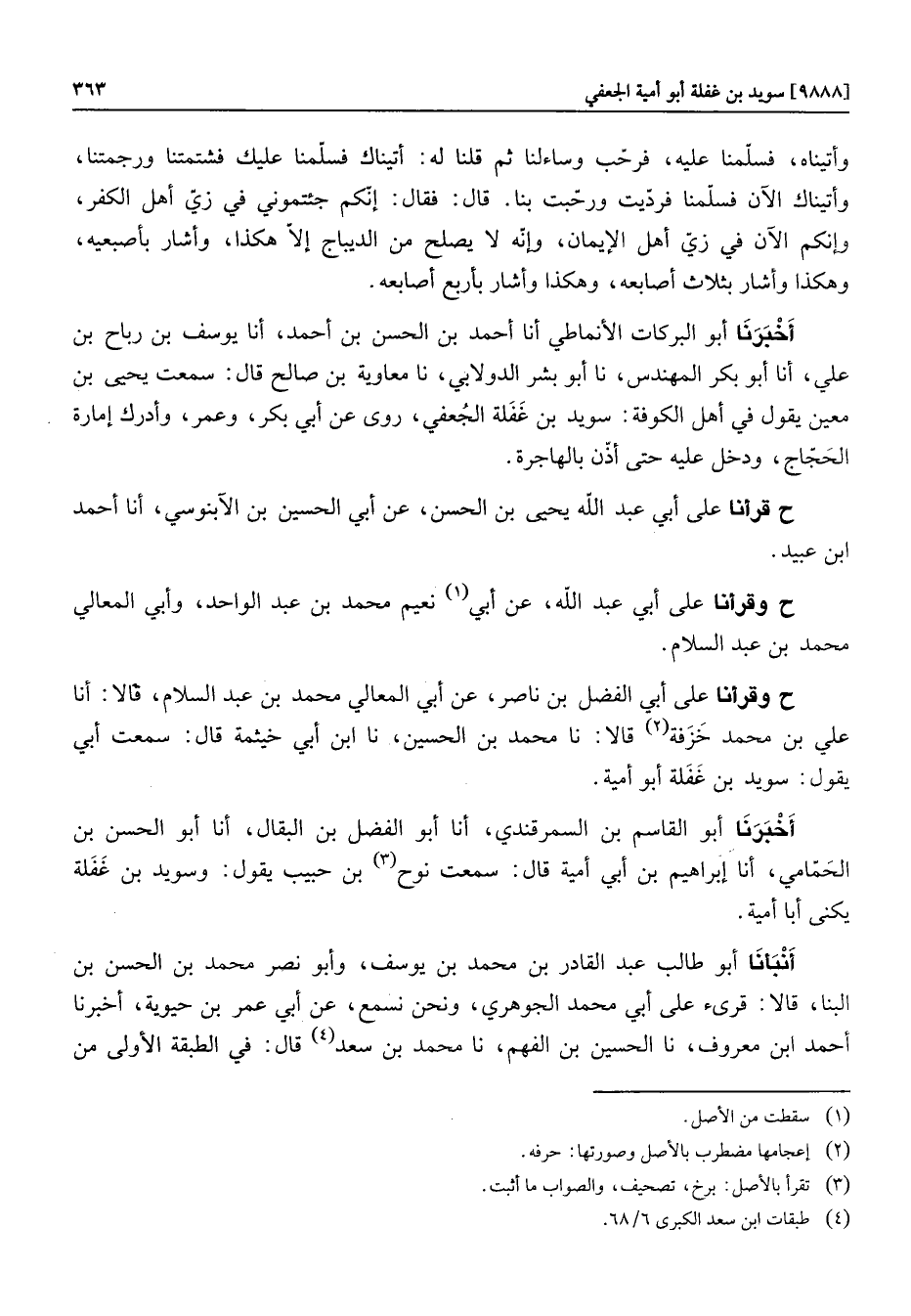ح وقرأنا على أبي الفضل بن ناصر، عن أبي المعالي محمد بن عبد السلام، قالا: أنا علي بن محمد خزفة «2» قالا: نا محمد بن الحسين، نا ابن أبي خيثمة قال: سمعت أبي يقول: سويد بن غفلة أبو أمية.