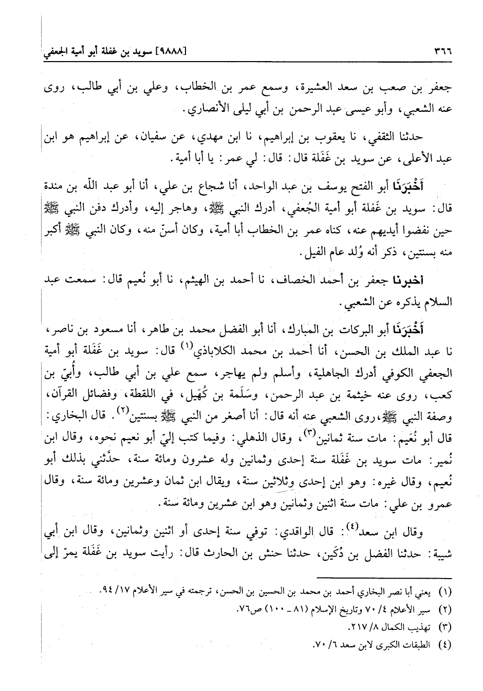 أخبرنا أبو الفتح يوسف بن عبد الواحد، أنا شجاع بن علي، أنا أبو عبد الله بن مندة قال: سويد بن غفلة أبو أمية الجعفي، أدرك النبي صلى الله عليه وسلم، وهاجر إليه، وأدرك دفن النبي صلى الله عليه وسلم حين نفضوا أيديهم عنه، كناه عمر بن الخطاب أبا أمية، وكان أسنّ منه، وكان النبي صلى الله عليه وسلم أكبر منه بسنتين، ذكر أنه ولد عام الفيل.