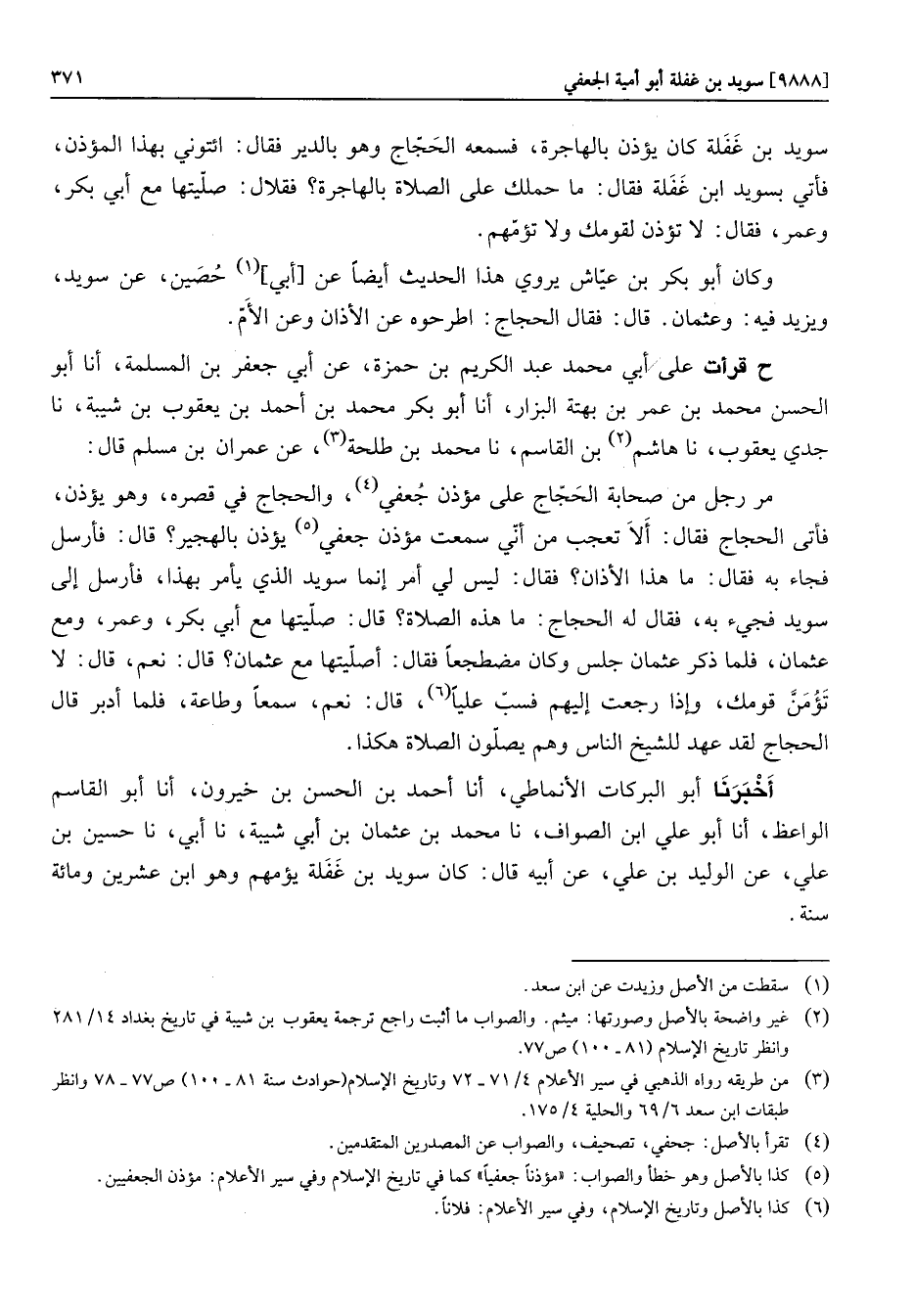 مر رجل من صحابة الحجّاج على مؤذن جعفي «4» ، والحجاج في قصره، وهو يؤذن، فأتى الحجاج فقال: ألا تعجب من أنّي سمعت مؤذن جعفي «5» يؤذن بالهجير؟ قال: فأرسل فجاء به فقال: ما هذا الأذان؟ فقال: ليس لي أمر إنما سويد الذي يأمر بهذا، فأرسل إلى سويد فجيء به، فقال له الحجاج: ما هذه الصلاة؟ قال: صلّيتها مع أبي بكر، وعمر، ومع عثمان، فلما ذكر عثمان جلس وكان مضطجعا فقال: أصلّيتها مع عثمان؟ قال: نعم، قال: لا تؤمنّ قومك، وإذا رجعت إليهم فسبّ عليا «6» ، قال: نعم، سمعا وطاعة، فلما أدبر قال الحجاج لقد عهد للشيخ الناس وهم يصلّون الصلاة هكذا. أخبرنا أبو البركات الأنماطي، أنا أحمد بن الحسن بن خيرون، أنا أبو القاسم الواعظ، أنا أبو علي ابن الصواف، نا محمد بن عثمان بن أبي شيبة، نا أبي، نا حسين بن علي، عن الوليد بن علي، عن أبيه قال: كان سويد بن غفلة يؤمهم وهو ابن عشرين ومائة سنة.