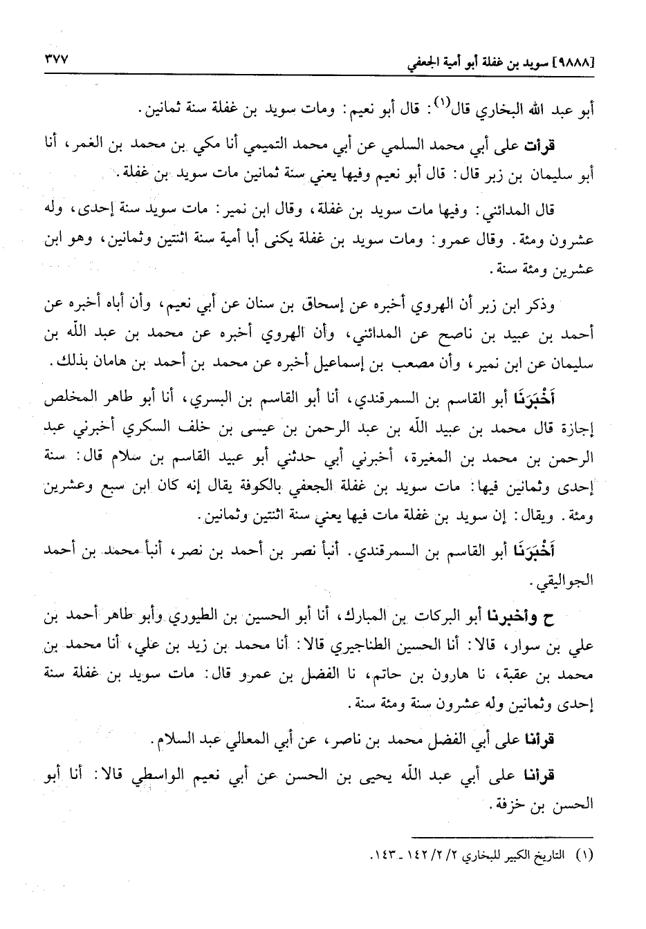 ح وأخبرنا أبو البركات بن المبارك، أنا أبو الحسين بن الطيوري وأبو طاهر أحمد بن علي بن سوار، قالا: أنا الحسين الطناجيري قالا: أنا محمد بن زيد بن علي، أنا محمد بن محمد بن عقبة، نا هارون بن حاتم، نا الفضل بن عمرو قال: مات سويد بن غفلة سنة إحدى وثمانين وله عشرون سنة ومئة سنة.