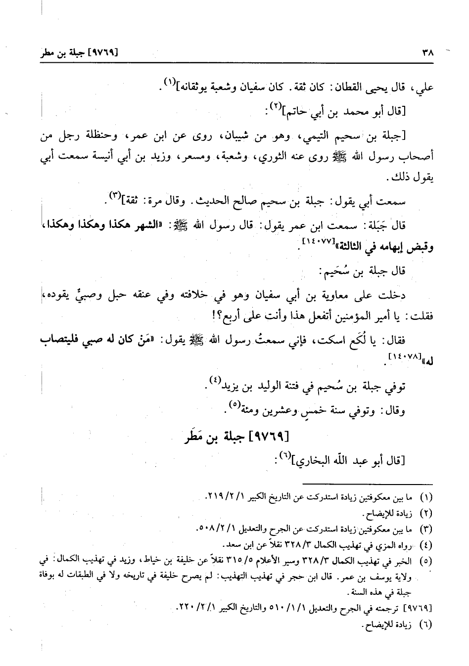 [جبلة بن سحيم التيمي، وهو من شيبان، روى عن ابن عمر، وحنظلة رجل من أصحاب رسول الله صلى الله عليه وسلم روى عنه الثوري، وشعبة، ومسعر، وزيد بن أبي أنيسة سمعت أبي يقول ذلك.