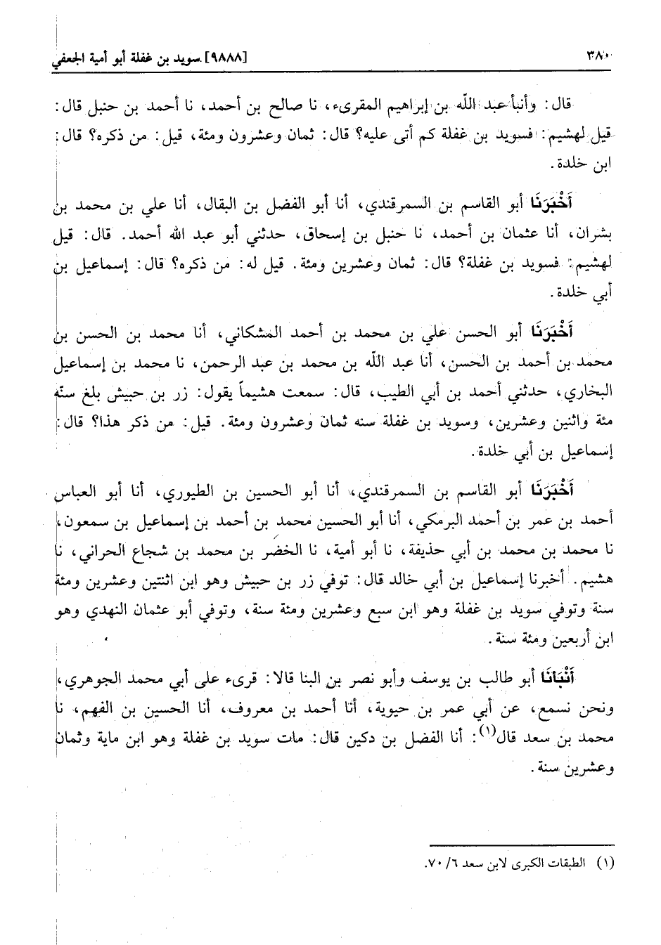 أنبأنا أبو طالب بن يوسف وأبو نصر بن البنا قالا: قرىء على أبي محمد الجوهري، ونحن نسمع، عن أبي عمر بن حيوية، أنا أحمد بن معروف، أنا الحسين بن الفهم، نا محمد بن سعد قال «1» : أنا الفضل بن دكين قال: مات سويد بن غفلة وهو ابن ماية وثمان وعشرين سنة.