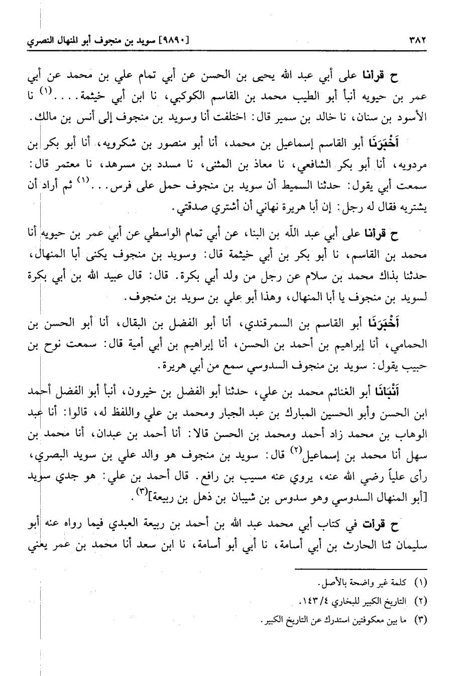 ح قرأنا على أبي عبد الله يحيى بن الحسن عن أبي تمام علي بن محمد بن أبي عمر بن حيويه أنبأ أبو الطيب محمد بن القاسم الكوكبي، نا ابن أبي خيثمة.... «1» نا الأسود بن سنان، نا خالد بن سمير قال: اختلفت أنا وسويد بن منجوف إلى أنس بن مالك.