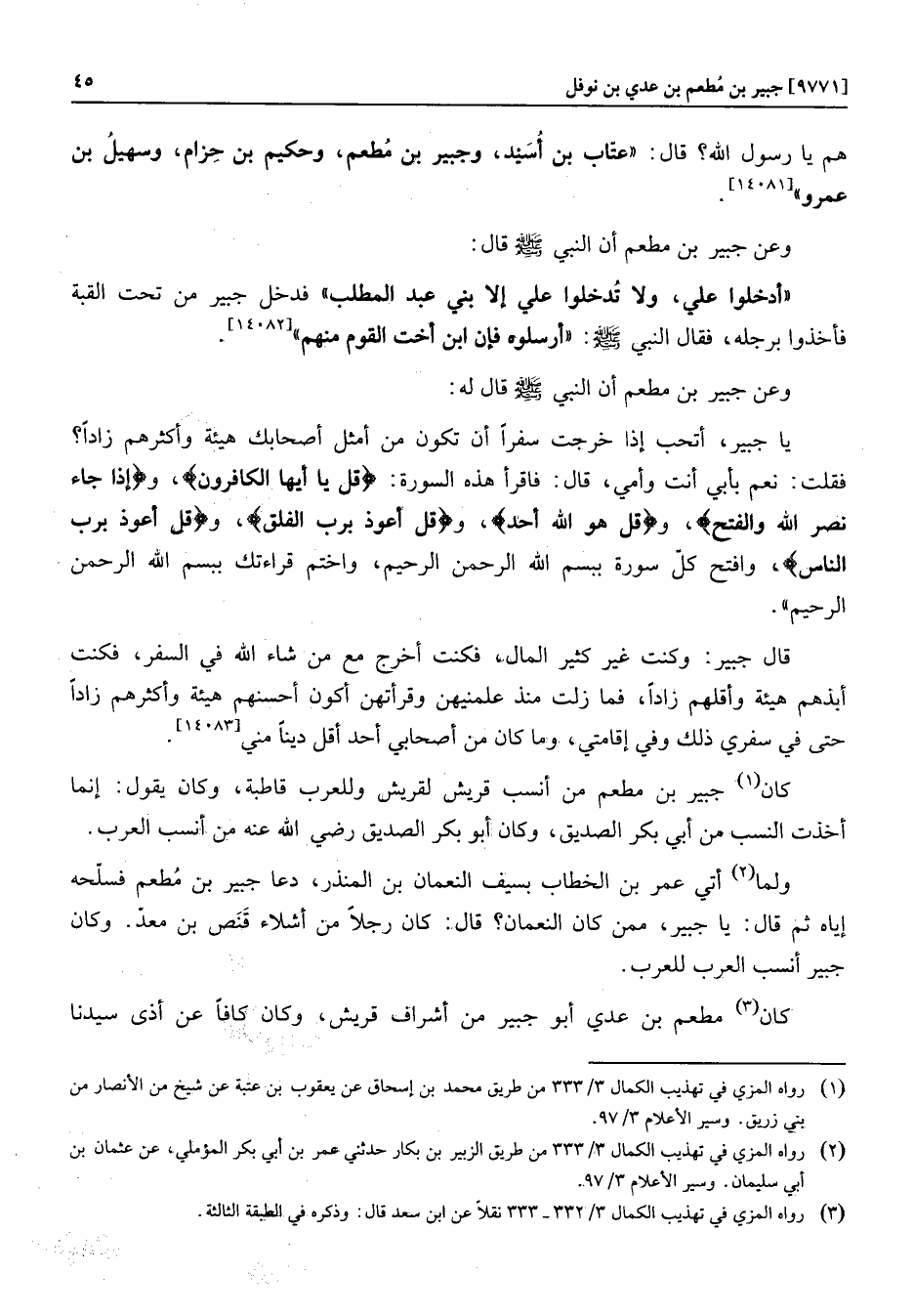 كان «1» جبير بن مطعم من أنسب قريش لقريش وللعرب قاطبة، وكان يقول: إنما أخذت النسب من أبي بكر الصديق، وكان أبو بكر الصديق رضي الله عنه من أنسب العرب.