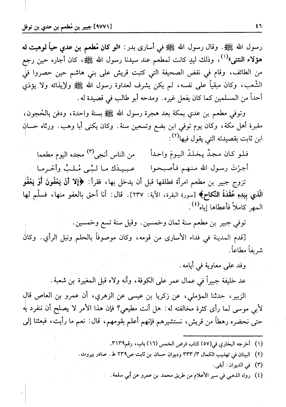 رسول الله صلى الله عليه وسلم. وقال رسول الله صلى الله عليه وسلم في أسارى بدر: «لو كان مطعم بن عدي حيا لوهبت له هؤلاء النتنى» «1» ، وذلك ليد كانت لمطعم عند سيدنا رسول الله صلى الله عليه وسلم، كان أجاره حين رجع من الطائف، وقام في نقض الصحيفة التي كتبت قريش على بني هاشم حين حصروا في الشّعب، وكان مبقيا على نفسه، لم يكن يشرف لعداوة رسول الله صلى الله عليه وسلم ولإيذائه ولا يؤذي أحدا من المسلمين كما كان يفعل غيره. ومدحه أبو طالب في قصيدة له.