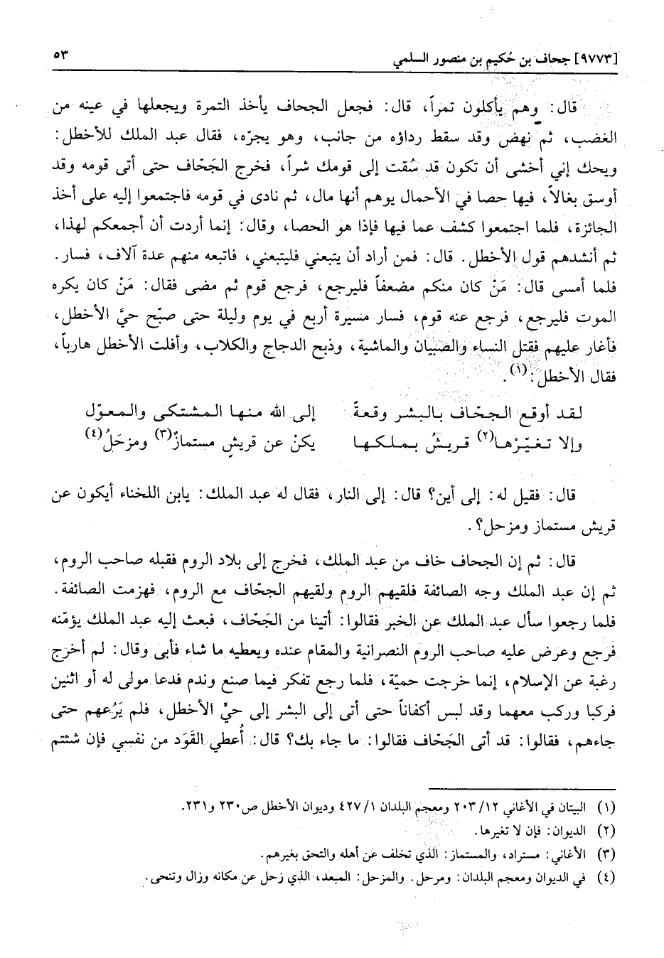 قال: ثم إن الجحاف خاف من عبد الملك، فخرج إلى بلاد الروم فقبله صاحب الروم، ثم إن عبد الملك وجه الصائفة فلقيهم الروم ولقيهم الجحّاف مع الروم، فهزمت الصائفة. فلما رجعوا سأل عبد الملك عن الخبر فقالوا: أتينا من الجحّاف، فبعث إليه عبد الملك يؤمّنه فرجع وعرض عليه صاحب الروم النصرانية والمقام عنده ويعطيه ما شاء فأبى وقال: لم أخرج رغبة عن الإسلام، إنما خرجت حميّة، فلما رجع تفكر فيما صنع وندم فدعا مولى له أو اثنين فركبا وركب معهما وقد لبس أكفافا حتى أتى إلى البشر إلى حيّ الأخطل، فلم يرعهم حتى جاءهم، فقالوا: قد أتى الجحّاف فقالوا: ما جاء بك؟ قال: أعطي القود من نفسي فإن شئتم