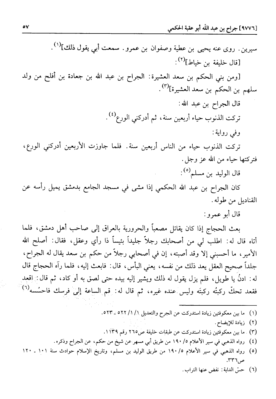 كان الجراح بن عبد الله الحكمي إذا مشى في مسجد الجامع بدمشق يميل رأسه عن القناديل من طوله.
