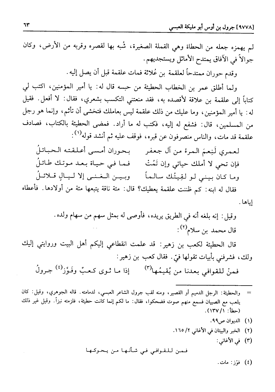 ولما أطلق عمر بن الخطاب الحطيئة من حبسه قال له: يا أمير المؤمنين، اكتب لي كتابا إلى علقمة بن علاقة لأقصده به، فقد منعتني التكسب بشعري، فقال: لا أفعل. فقيل له: يا أمير المؤمنين، وما عليك من ذلك علقمة ليس بعاملك فتخشى أن تأثم، وإنما هو رجل من المسلمين، قال: فشفع له إليه، فكتب له ما أراد. فمضى الحطيئة بالكتاب، فصادف علقمة قد مات، والناس منصرفون عن قبره، فوقف عليه ثم أنشد قوله «1» :