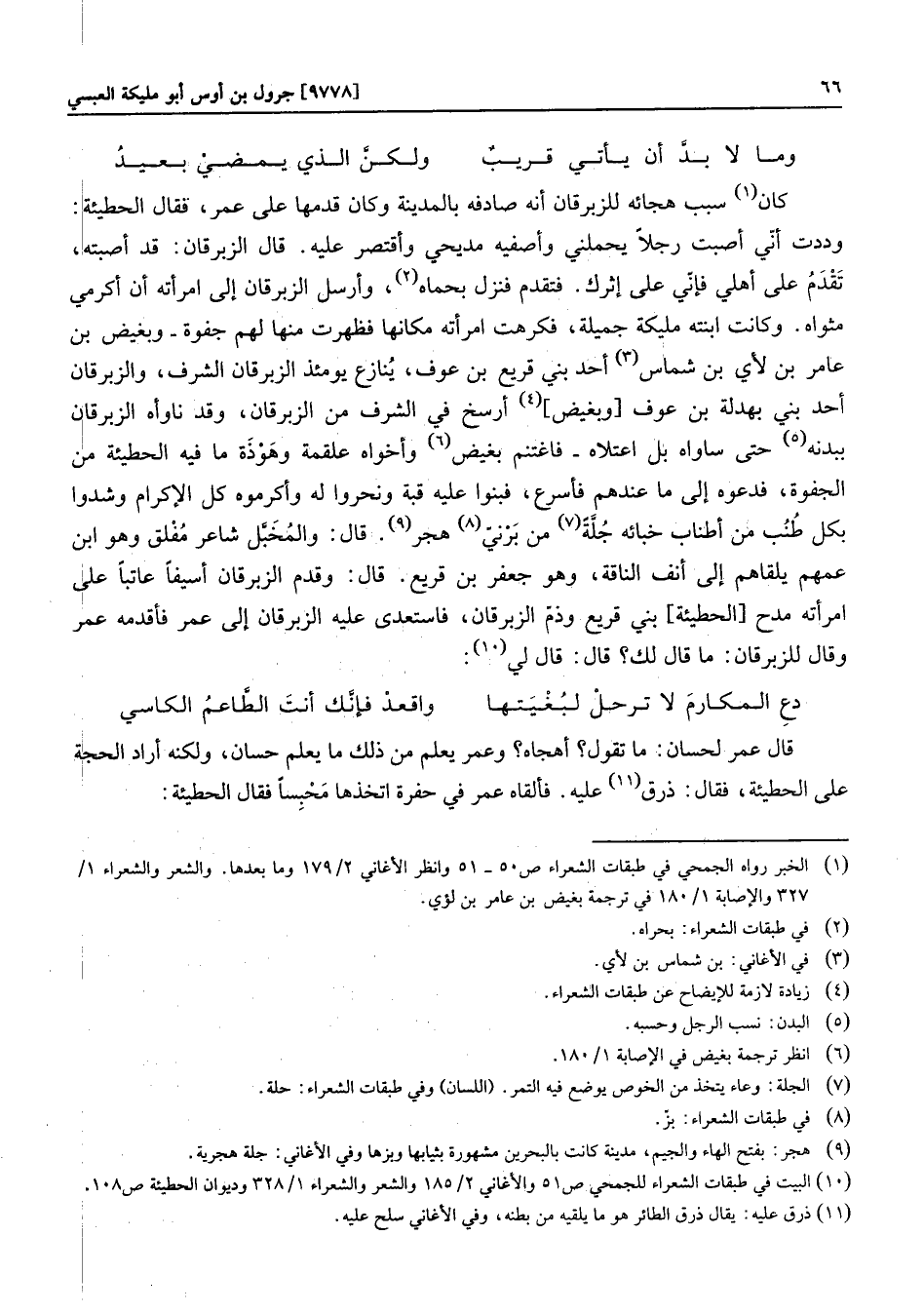 كان «1» سبب هجائه للزبرقان أنه صادفه بالمدينة وكان قدمها على عمر، فقال الحطيئة: وددت أنّي أصبت رجلا يحملني وأصفيه مديحي وأقتصر عليه. قال الزبرقان: قد أصبته، تقدم على أهلي فإنّي على إثرك. فتقدم فنزل بحماه «2» ، وأرسل الزبرقان إلى امرأته أن أكرمي مثواه. وكانت ابنته مليكة جميلة، فكرهت امرأته مكانها فظهرت منها لهم جفوة- وبغيض بن عامر بن لأي بن شماس «3» أحد بني قريع بن عوف، ينازع يومئذ الزبرقان الشرف، والزبرقان أحد بني بهدلة بن عوف [وبغيض] «4» أرسخ في الشرف من الزبرقان، وقد ناوأه الزبرقان ببدنه «5» حتى ساواه بل اعتلاه- فاغتنم بغيض «6» وأخواه علقمة وهوذة ما فيه الحطيئة من الجفوة، فدعوه إلى ما عندهم فأسرع، فبنوا عليه قبة ونحروا له وأكرموه كل الإكرام وشدوا بكل طنب من أطناب خبائه جلّة «7» من برنيّ «8» هجر «9» . قال: والمخبّل شاعر مفلق وهو ابن عمهم يلقاهم إلى أنف الناقة، وهو جعفر بن قريع. قال: وقدم الزبرقان أسيفا عاتبا على امرأته مدح [الحطيئة] بني قريع وذمّ الزبرقان، فاستعدى عليه الزبرقان إلى عمر فأقدمه عمر وقال للزبرقان: ما قال لك؟ قال: قال لي «10» :