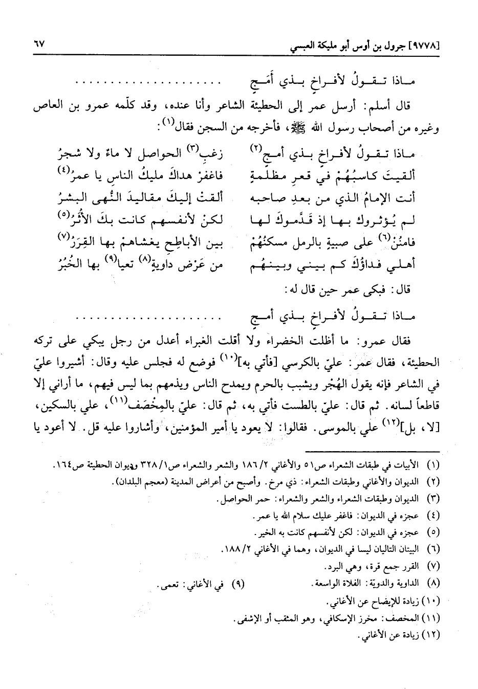 ماذا تقول لأفراخ بذي أمج............... .....فقال عمرو: ما أظلت الخضراء ولا أقلت الغبراء أعدل من رجل يبكي على تركه الحطيئة، فقال عمر: عليّ بالكرسي [فأتي به] «10» فوضع له فجلس عليه وقال: أشيروا عليّ في الشاعر فإنه يقول الهجر ويشبب بالحرم ويمدح الناس ويذمهم بما ليس فيهم، ما أراني إلا قاطعا لسانه. ثم قال: عليّ بالطست فأتي به، ثم قال: عليّ بالمخصف «11» ، علي بالسكين، [لا، بل] «12» علي بالموسى. فقالوا: لا يعود يا أمير المؤمنين، وأشاروا عليه قل. لا أعود يا