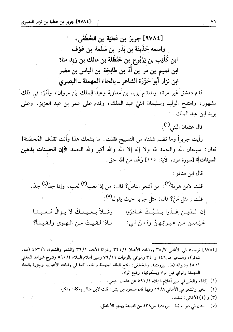 [9784] جرير بن عطيّة بن الخطفى، واسمه حذيفة بن بدر بن سلمة بن عوف ابن كليب بن يربوع بن حنظلة بن مالك بن زيد مناة ابن تميم بن مر بن أدّ بن طابخةبن الياس بن مضر ابن نزار أبو حزرة الشاعر- بالحاء المهملة- البصري