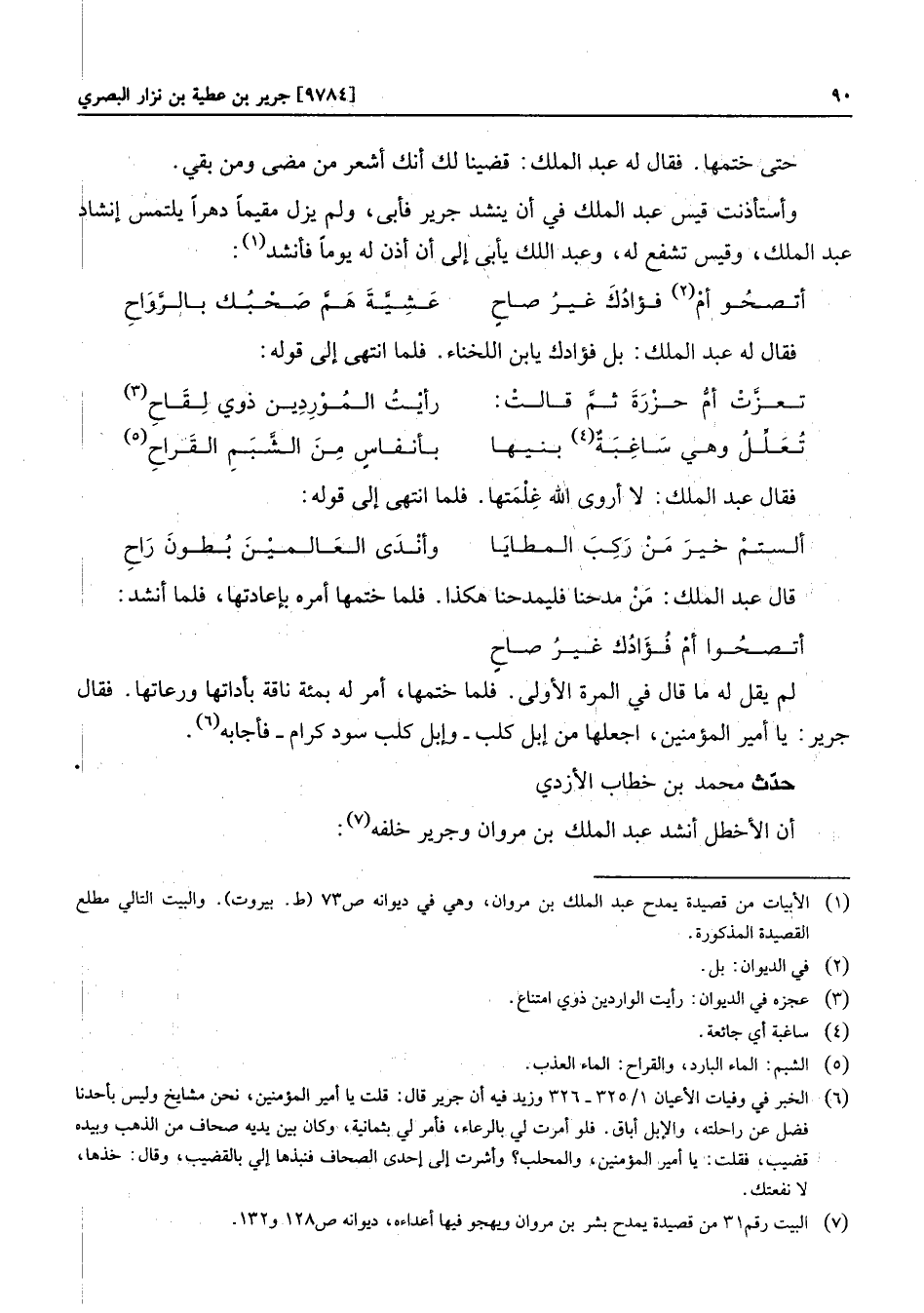 حدّث محمد بن خطاب الأزدي أن الأخطل أنشد عبد الملك بن مروان وجرير خلفه «7» :