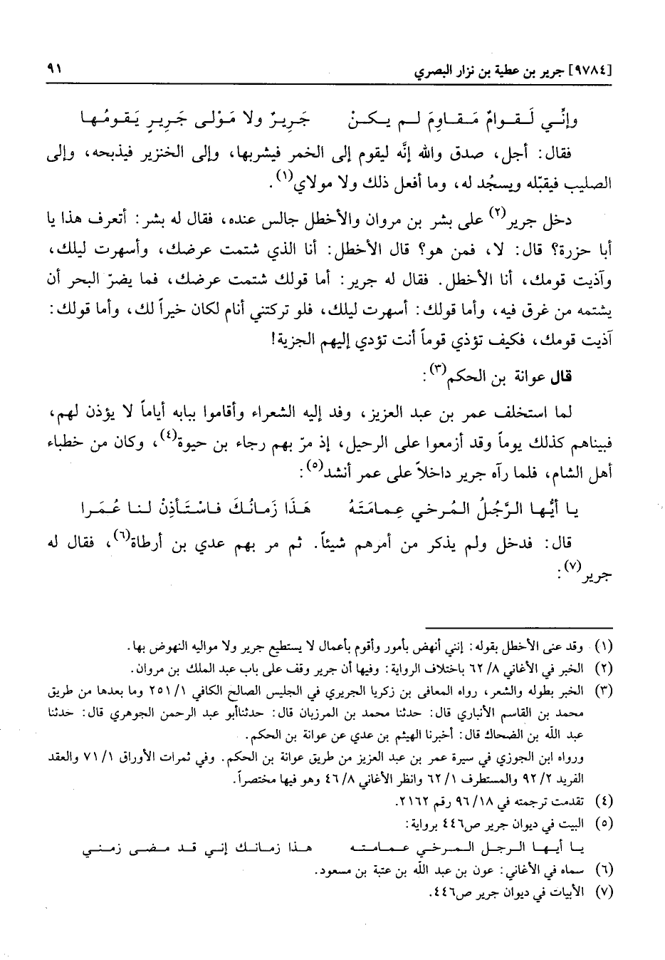 فقال: أجل، صدق والله إنّه ليقوم إلى الخمر فيشربها، وإلى الخنزير فيذبحه، وإلى الصليب فيقبّله ويسجد له، وما أفعل ذلك ولا مولاي «1» . دخل جرير «2» على بشر بن مروان والأخطل جالس عنده، فقال له بشر: أتعرف هذا يا أبا حزرة؟ قال: لا، فمن هو؟ قال الأخطل: أنا الذي شتمت عرضك، وأسهرت ليلك، وآذيت قومك، أنا الأخطل. فقال له جرير: أما قولك شتمت عرضك، فما يضرّ البحر أن يشتمه من غرق فيه، وأما قولك: أسهرت ليلك، فلو تركتني أنام لكان خيرا لك، وأما قولك: