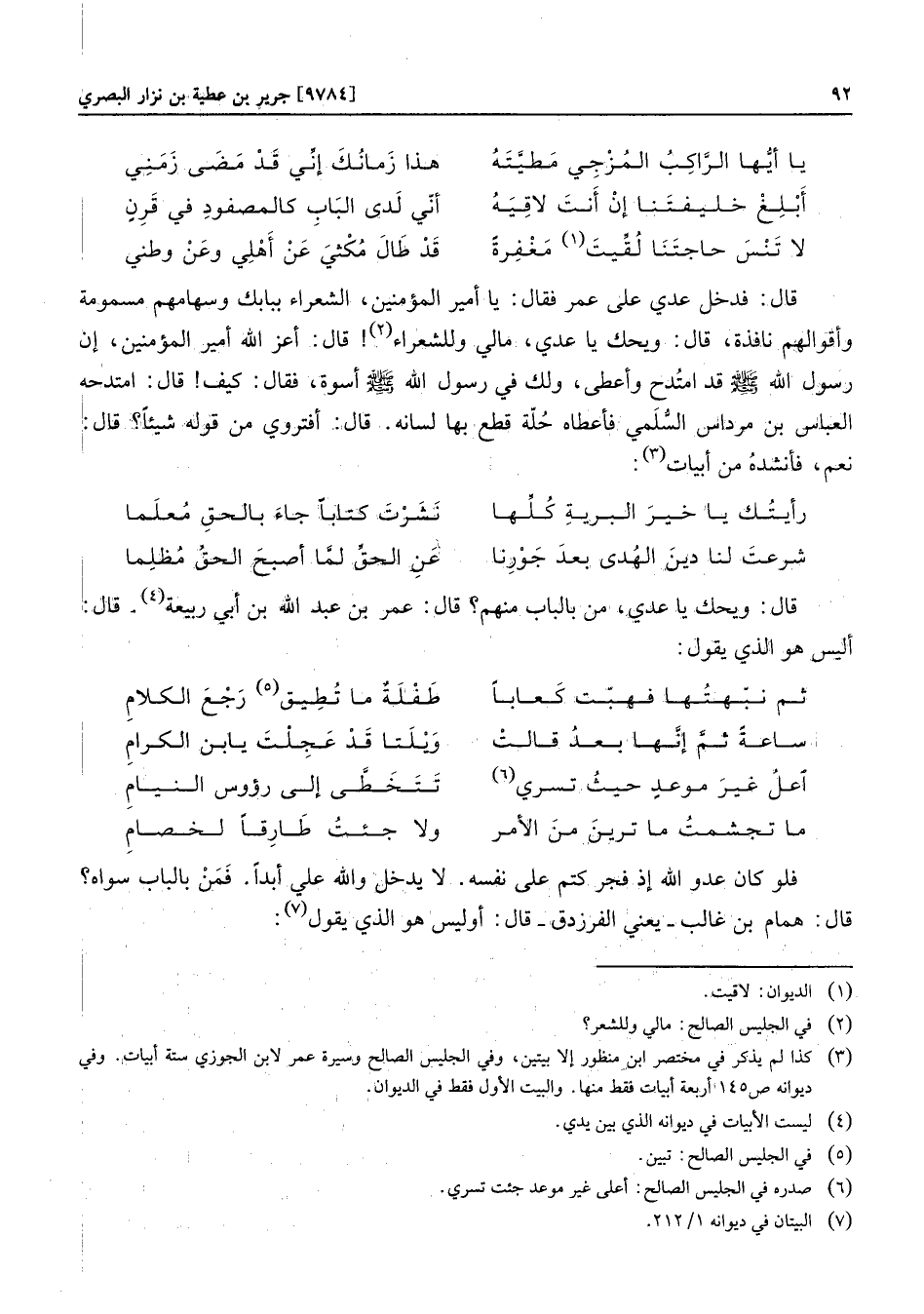 قال: همام بن غالب- يعني الفرزدق- قال: أوليس هو الذي يقول «7» :