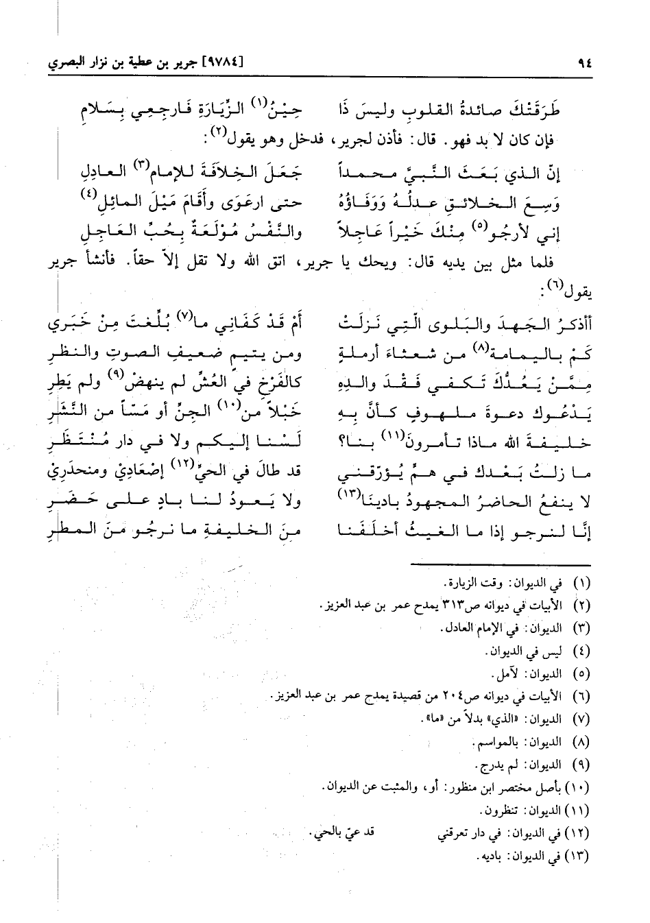فلما مثل بين يديه قال: ويحك يا جرير، اتق الله ولا تقل إلّا حقا. فأنشأ جرير يقول «6» :