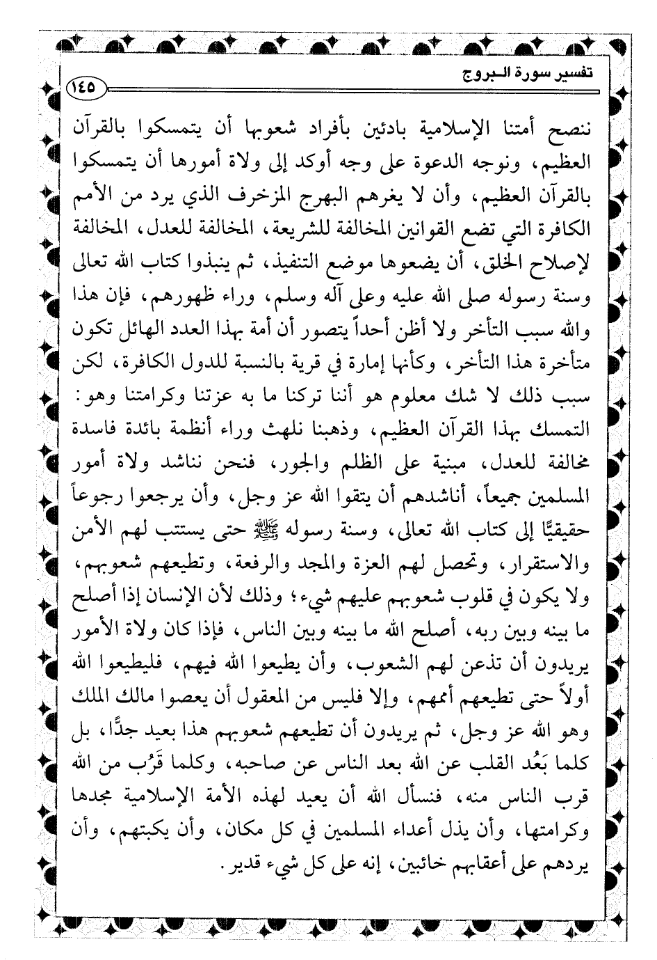 ننصح أمتنا الإسلامية بادئين بأفراد شعوبها أن يتمسكوا بالقرآن العظيم، ونوجه الدعوة على وجه أوكد إلى ولاة أمورها أن يتمسكوا بالقرآن العظيم، وأن لا يغرهم البهرج المزخرف الذي يرد من الأمم الكافرة التي تضع القوانين المخالفة للشريعة، المخالفة للعدل، المخالفة لإصلاح الخلق، أن يضعوها موضع التنفيذ، ثم ينبذوا كتاب الله تعالى وسنة رسوله صلى الله عليه وعلى آله وسلم، وراء ظهورهم، فإن هذا والله سبب التأخر ولا أظن أحداً يتصور أن أمة بهذا العدد الهائل تكون متأخرة هذا التأخر، وكأنها إمارة في قرية بالنسبة للدول الكافرة، لكن سبب ذلك لا شك معلوم هو أننا تركنا ما به عزتنا وكرامتنا وهو: التمسك بهذا القرآن العظيم، وذهبنا نلهث وراء أنظمة بائدة فاسدة مخالفة للعدل، مبنية على الظلم والجور، فنحن نناشد ولاة أمور المسلمين جميعاً، أناشدهم أن يتقوا الله عز وجل، وأن يرجعوا رجوعاً حقيقيًّا إلى كتاب الله تعالى، وسنة رسوله صلى الله عليه وسلّم حتى يستتب لهم الأمن والاستقرار، وتحصل لهم العزة والمجد والرفعة، وتطيعهم شعوبهم، ولا يكون في قلوب شعوبهم عليهم شيء؛ وذلك لأن الإنسان إذا أصلح ما بينه وبين ربه، أصلح الله ما بينه وبين الناس، فإذا كان ولاة الأمور يريدون أن تذعن لهم الشعوب، وأن يطيعوا الله فيهم، فليطيعوا الله أولاً حتى تطيعهم أممهم، وإلا فليس من المعقول أن يعصوا مالك الملك وهو الله عز وجل، ثم يريدون أن تطيعهم شعوبهم هذا بعيد