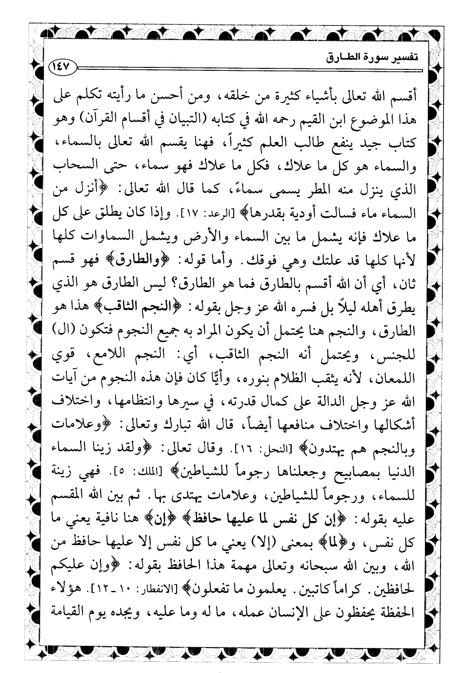 أقسم الله تعالى بأشياء كثيرة من خلقه، ومن أحسن ما رأيته تكلم على هذا الموضوع ابن القيم رحمه الله في كتابه (التبيان في أقسام القرآن) وهو كتاب جيد ينفع طالب العلم كثيراً، فهنا يقسم الله تعالى بالسماء، والسماء هو كل ما علا، فكل ما علاك فهو سماء، حتى السحاب الذي ينزل منه المطر يسمى سماءً، كما قال الله تعالى: {أنزل من السماء ماء فسالت أودية بقدرها} [الرعد: ١٧] . وإذا كان يطلق على كل ما علاك فإنه يشمل ما بين السماء والأرض ويشمل السماوات كلها لأنها كلها قد علتك وهي فوقك. وأما قوله: {والطارق} فهو قسم ثان، أي أن الله أقسم بالطارق فما هو الطارق؟ ليس الطارق هو الذي يطرق أهله ليلاً بل فسره الله عز وجل بقوله: {النجم الثاقب} هذا هو الطارق، والنجم هنا يحتمل أن يكون المراد به جميع النجوم فتكون (ال) للجنس، ويحتمل أنه النجم الثاقب، أي: النجم اللامع، قوي اللمعان، لأنه يثقب الظلام بنوره، وأيًّا كان فإن هذه النجوم من آيات الله عز وجل الدالة على كمال قدرته، في سيرها وانتظامها، واختلاف أشكالها واختلاف منافعها أيضاً، قال الله تبارك وتعالى: {وعلامات وبالنجم هم يهتدون} [النحل: ١٦] . وقال تعالى: {ولقد زينا السماء الدنيا بمصابيح وجعلناها رجوماً للشياطين} [الملك: ٥] . فهي زينة للسماء، ورجوماً للشياطين، وعلامات يهتدى بها.