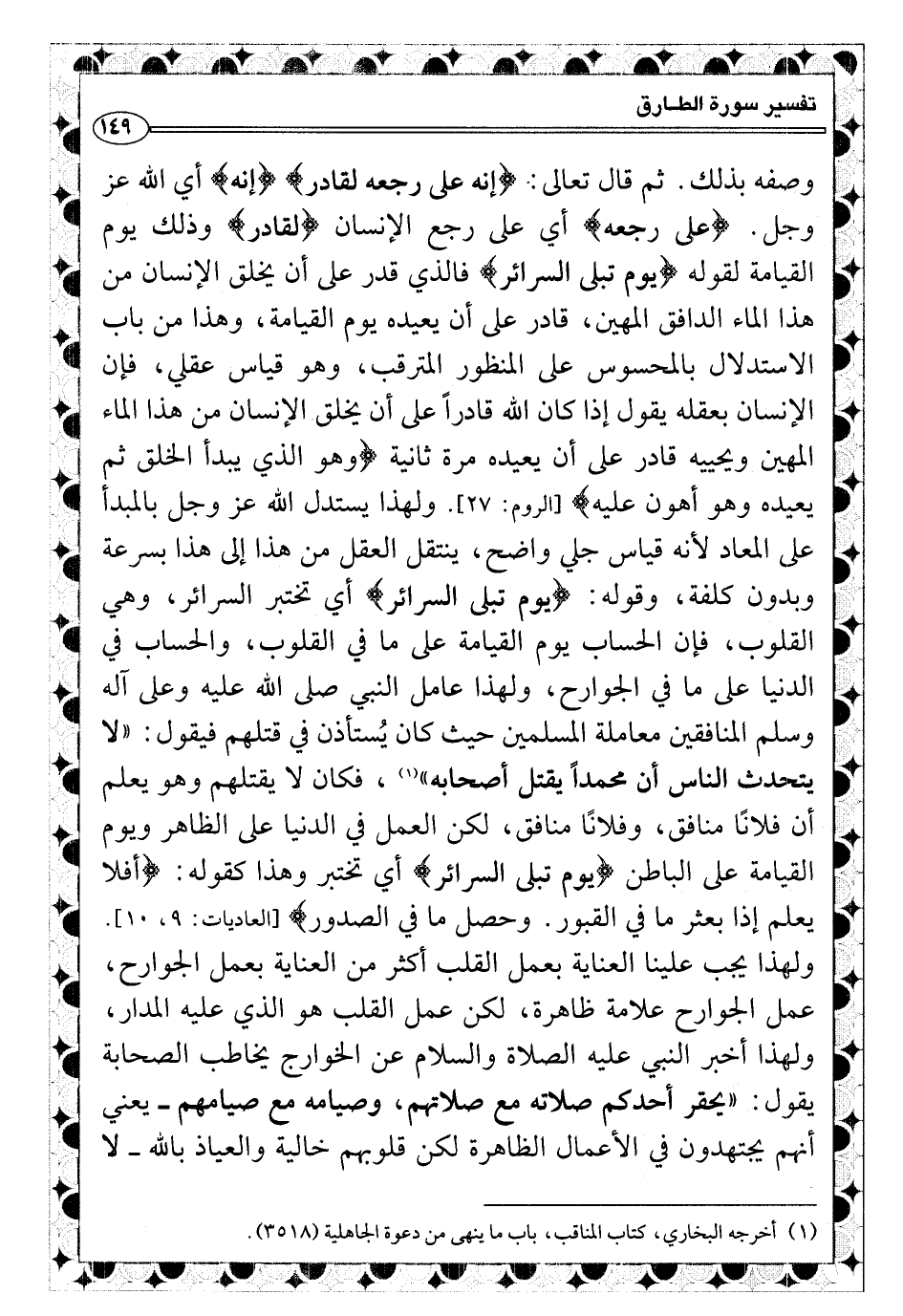 ولهذا يستدل الله عز وجل بالمبدأ على المعاد لأنه قياس جلي واضح، ينتقل العقل من هذا إلى هذا بسرعة وبدون كلفة، وقوله: {يوم تبلى السرائر} أي تختبر السرائر، وهي القلوب، فإن الحساب يوم القيامة على ما في القلوب، والحساب في الدنيا على ما في الجوارح، ولهذا عامل النبي صلى الله عليه وعلى آله وسلم المنافقين معاملة المسلمين حيث كان يُستأذن في قتلهم فيقول: «لا يتحدث الناس أن محمداً يقتل أصحابه» (¬١) ، فكان لا يقتلهم وهو يعلم أن فلانًا منافق، وفلانًا منافق، لكن العمل في الدنيا على الظاهر ويوم القيامة على الباطن {يوم تبلى السرائر} أي تختبر وهذا كقوله: {أفلا يعلم إذا بعثر ما في القبور. وحصل ما في الصدور} [العاديات: ٩، ١٠] . ولهذا يجب علينا العناية بعمل القلب أكثر من العناية بعمل الجوارح، عمل الجوارح علامة ظاهرة، لكن عمل القلب هو الذي عليه المدار، ولهذا أخبر النبي عليه الصلاة والسلام عن الخوارج يخاطب الصحابة يقول: «يحقر أحدكم صلاته مع صلاتهم، وصيامه مع صيامهم ـ يعني أنهم يجتهدون في الأعمال الظاهرة لكن قلوبهم خالية والعياذ بالله ـ لا يتجاوز