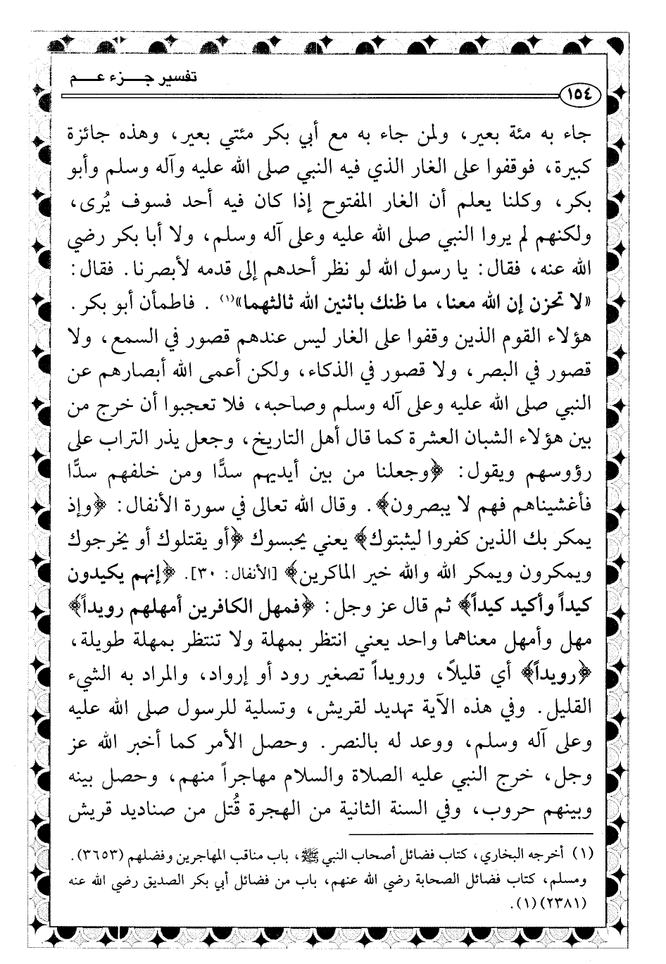 فهؤلاء القوم الذين وقفوا على الغار ليس عندهم قصور في السمع، ولا قصور في البصر، ولا قصور في الذكاء، ولكن أعمى الله أبصارهم عن النبي صلى الله عليه وعلى آله وسلم وصاحبه، فلا تعجبوا أن خرج من بين هؤلاء الشبان العشرة كما قال أهل التاريخ، وجعل يذر التراب على رؤوسهم ويقول: {وجعلنا من بين أيديهم سدًّا ومن خلفهم سدًّا فأغشيناهم فهم لا يبصرون} . وقال الله تعالى في سورة الأنفال: {وإذ يمكر بك الذين كفروا ليثبتوك} يعني يحبسوك {أو يقتلوك أو يخرجوك ويمكرون ويمكر الله والله خير الماكرين} [الأنفال: ٣٠] . {إنهم يكيدون كيداً وأكيد كيداً} ثم قال عز وجل: {فمهل الكافرين أمهلهم رويداً} مهل وأمهل معناهما واحد يعني انتظر بمهلة ولا تنتظر بمهلة طويلة، {رويداً} أي قليلاً، ورويداً تصغير رود أو إرواد، والمراد به الشيء القليل. وفي هذه الآية تهديد لقريش، وتسلية للرسول صلى الله عليه وعلى آله وسلم، ووعد له بالنصر. وحصل الأمر كما أخبر الله عز وجل، خرج النبي عليه الصلاة والسلام مهاجراً منهم، وحصل بينه وبينهم حروب، وفي السنة الثانية من الهجرة قُتل من صناديد قريش