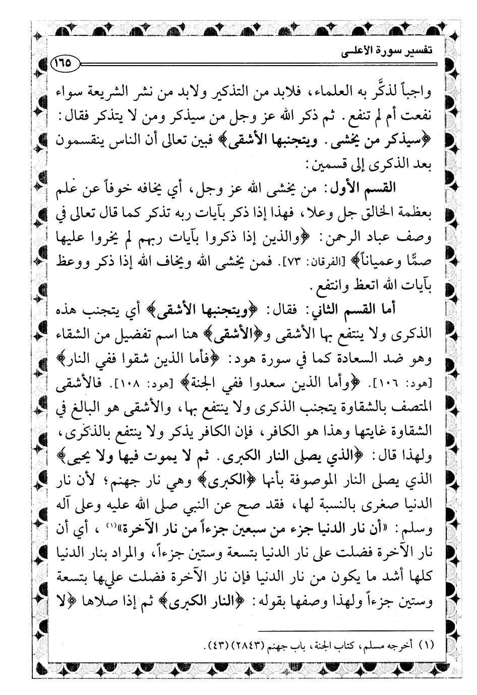 أما القسم الثاني: فقال: {ويتجنبها الأشقى} أي يتجنب هذه الذكرى ولا ينتفع بها الأشقى و {الأشقى} هنا اسم تفضيل من الشقاء وهو ضد السعادة كما في سورة هود: {فأما الذين شقوا ففي النار} [هود: ١٠٦] . {وأما الذين سعدوا ففي الجنة} [هود: ١٠٨] . فالأشقى المتصف بالشقاوة يتجنب الذكرى ولا ينتفع بها، والأشقى هو البالغ في الشقاوة غايتها وهذا هو الكافر، فإن الكافر يذكر ولا ينتفع بالذكرى، ولهذا قال: {الذي يصلى النار الكبرى. ثم لا يموت فيها ولا يحيى} الذي يصلى النار الموصوفة بأنها {الكبرى} وهي نار جهنم؛ لأن نار الدنيا صغرى بالنسبة لها، فقد صح عن النبي صلى الله عليه وعلى آله وسلم: «أن نار الدنيا جزء من سبعين جزءاً من نار الآخرة» (¬١) ، أي أن نار الآخرة فضلت على نار الدنيا بتسعة وستين جزءاً، والمراد بنار الدنيا كلها أشد ما يكون من نار الدنيا فإن نار الآخرة فضلت عليها بتسعة وستين جزءاً ولهذا وصفها بقوله: {النار الكبرى} ثم إذا صلاها {لا