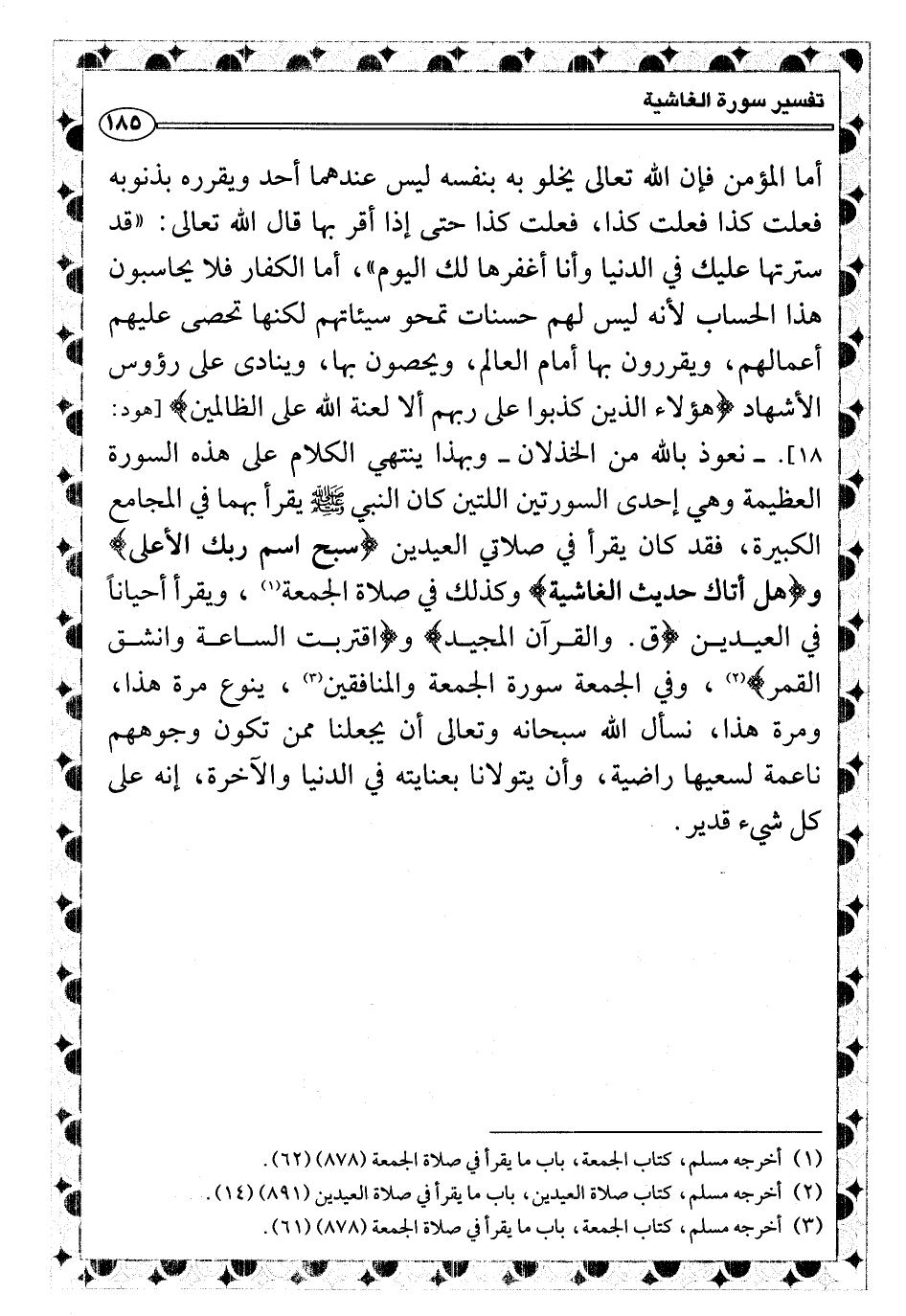 ـ نعوذ بالله من الخذلان ـ وبهذا ينتهي الكلام على هذه السورة العظيمة وهي إحدى السورتين اللتين كان النبي صلى الله عليه وسلّم يقرأ بهما في المجامع الكبيرة، فقد كان يقرأ في صلاتي العيدين {سبح اسم ربك الأعلى} و {هل أتاك حديث الغاشية} وكذلك في صلاة الجمعة (¬١) ، ويقرأ أحياناً في العيدين {ق. والقرآن المجيد} و {اقتربت الساعة وانشق القمر} (¬٢) ، وفي الجمعة سورة الجمعة والمنافقين (¬٣) ، ينوع مرة هذا، ومرة هذا، نسأل الله سبحانه وتعالى أن يجعلنا ممن تكون وجوههم ناعمة لسعيها راضية، وأن يتولانا بعنايته في الدنيا والآخرة، إنه على كل شيء قدير.