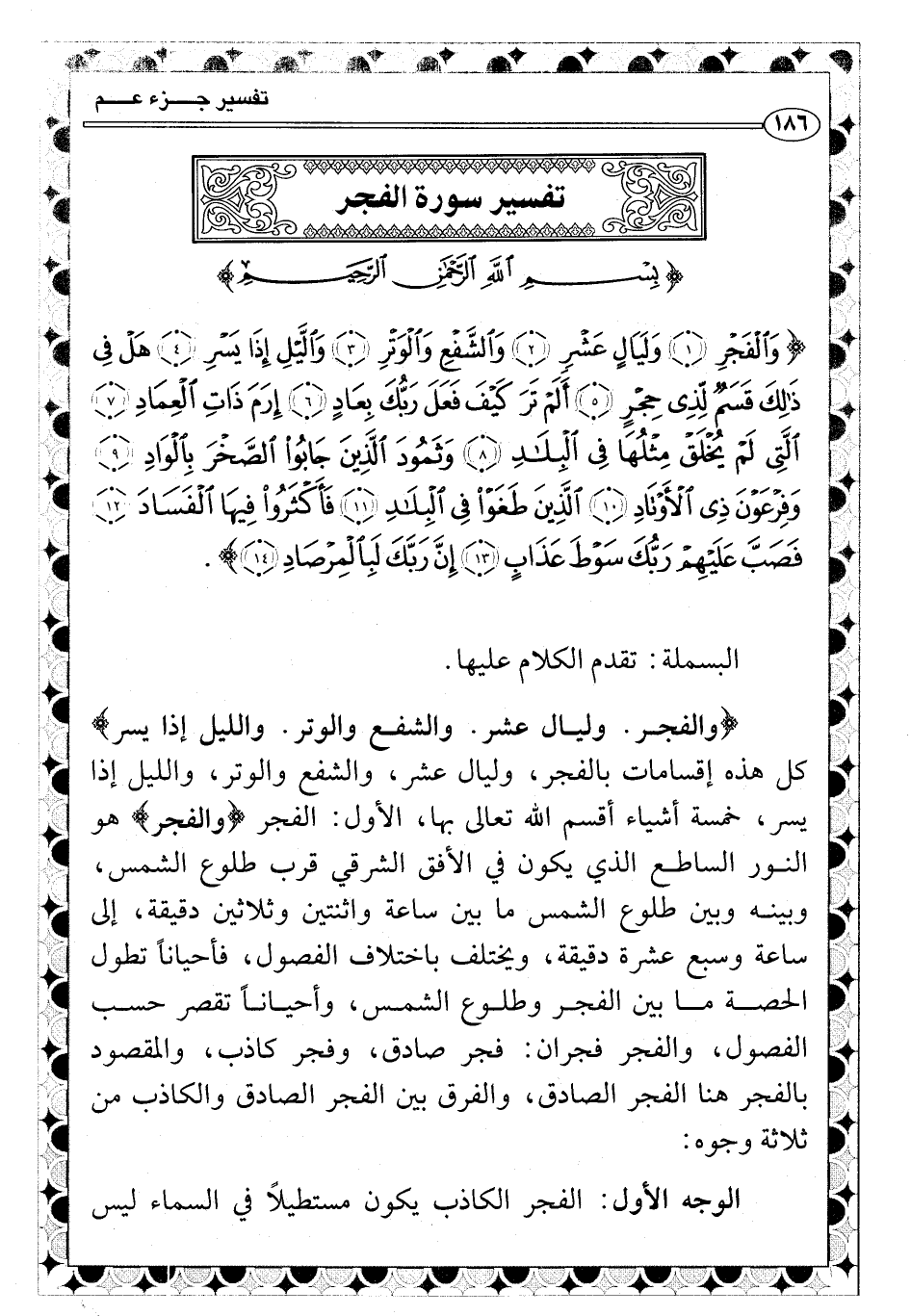 {والفجر. وليال عشر. والشفع والوتر. والليل إذا يسر} كل هذه إقسامات بالفجر، وليال عشر، والشفع والوتر، والليل إذا يسر، خمسة أشياء أقسم الله تعالى بها، الأول: الفجر {والفجر} هو النور الساطع الذي يكون في الأفق الشرقي قرب طلوع الشمس، وبينه وبين طلوع الشمس ما بين ساعة واثنتين وثلاثين دقيقة، إلى ساعة وسبع عشرة دقيقة، ويختلف باختلاف الفصول، فأحياناً تطول الحصة ما بين الفجر وطلوع الشمس، وأحياناً تقصر حسب الفصول، والفجر فجران: فجر صادق، وفجر كاذب، والمقصود بالفجر هنا الفجر الصادق، والفرق بين الفجر الصادق والكاذب من ثلاثة وجوه:
