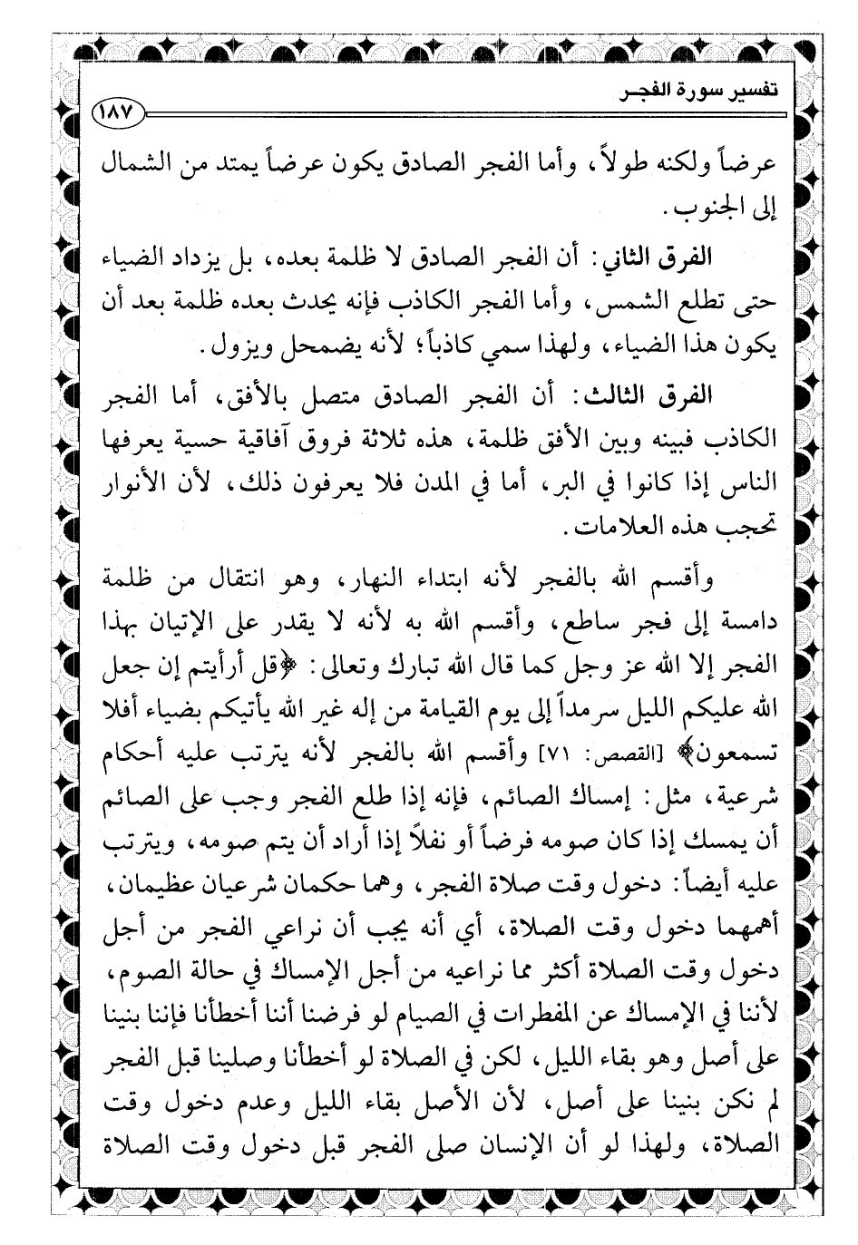وأقسم الله بالفجر لأنه ابتداء النهار، وهو انتقال من ظلمة دامسة إلى فجر ساطع، وأقسم الله به لأنه لا يقدر على الإتيان بهذا الفجر إلا الله عز وجل كما قال الله تبارك وتعالى: {قل أرأيتم إن جعل الله عليكم الليل سرمداً إلى يوم القيامة من إله غير الله يأتيكم بضياء أفلا تسمعون} [القصص: ٧١] وأقسم الله بالفجر لأنه يترتب عليه أحكام شرعية، مثل: إمساك الصائم، فإنه إذا طلع الفجر وجب على الصائم أن يمسك إذا كان صومه فرضاً أو نفلاً إذا أراد أن يتم صومه، ويترتب عليه أيضاً: دخول وقت صلاة الفجر، وهما حكمان شرعيان عظيمان، أهمهما دخول وقت الصلاة، أي أنه يجب أن نراعي الفجر من أجل دخول وقت الصلاة أكثر مما نراعيه من أجل الإمساك في حالة الصوم، لأننا في الإمساك عن المفطرات في الصيام لو فرضنا أننا أخطأنا فإننا بنينا على أصل وهو بقاء الليل، لكن في الصلاة لو أخطأنا وصلينا قبل الفجر لم نكن بنينا على أصل، لأن الأصل بقاء الليل وعدم دخول وقت الصلاة، ولهذا لو أن الإنسان صلى الفجر قبل دخول وقت الصلاة