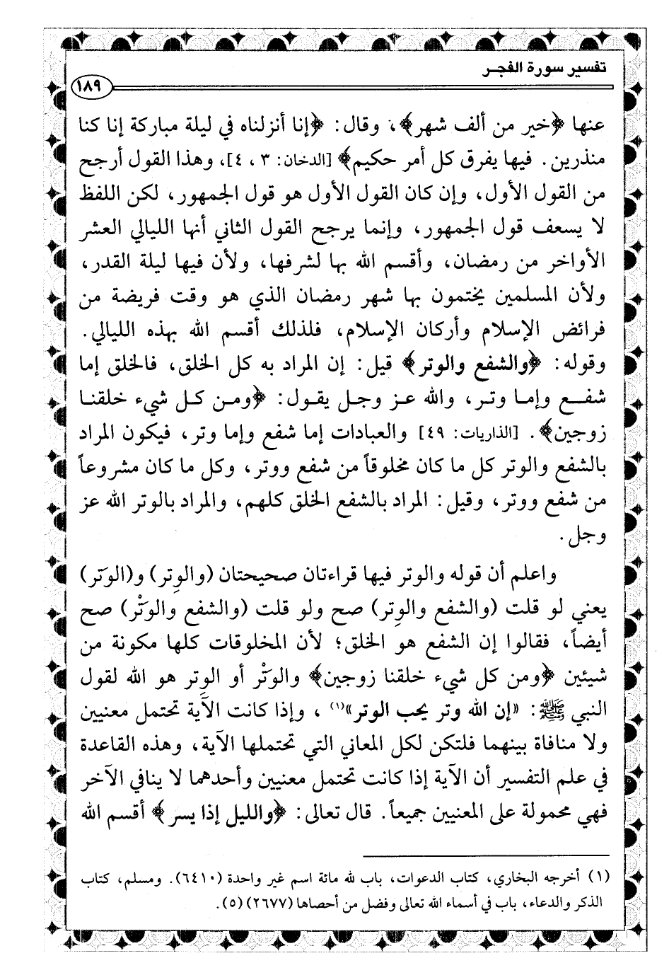 واعلم أن قوله والوتر فيها قراءتان صحيحتان (والوِتر) و (الوَتر) يعني لو قلت (والشفع والوِتر) صح ولو قلت (والشفع والوَتْر) صح أيضاً، فقالوا إن الشفع هو الخلق؛ لأن المخلوقات كلها مكونة من شيئين {ومن كل شيء خلقنا زوجين} والوَتْر أو الوِتر هو الله لقول النبي صلى الله عليه وسلّم: «إن الله وتر يحب الوتر» (¬١) ، وإذا كانت الآية تحتمل معنيين ولا منافاة بينهما فلتكن لكل المعاني التي تحتملها الآية، وهذه القاعدة في علم التفسير أن الآية إذا كانت تحتمل معنيين وأحدهما لا ينافي الآخر فهي محمولة على المعنيين جميعاً. قال تعالى: {والليل إذا يسر} أقسم الله