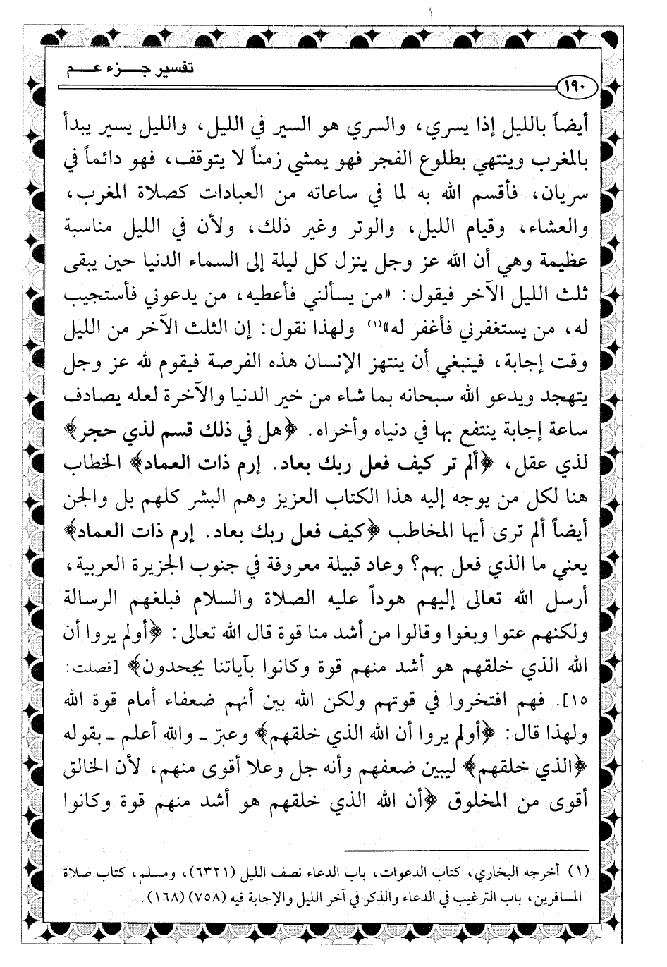 {هل في ذلك قسم لذي حجر} لذي عقل، {ألم تر كيف فعل ربك بعاد. إرم ذات العماد} الخطاب هنا لكل من يوجه إليه هذا الكتاب العزيز وهم البشر كلهم بل والجن أيضاً ألم تر أيها المخاطب {كيف فعل ربك بعاد. إرم ذات العماد} يعني ما الذي فعل بهم؟ وعاد قبيلة معروفة في جنوب الجزيرة العربية، أرسل الله تعالى إليهم هوداً عليه الصلاة والسلام فبلغهم الرسالة ولكنهم عتوا وبغوا وقالوا من أشد منا قوة قال الله تعالى: {أولم يروا أن الله الذي خلقهم هو أشد منهم قوة وكانوا بآياتنا يجحدون} [فصلت: ١٥] . فهم افتخروا في قوتهم ولكن الله بين أنهم ضعفاء أمام قوة الله ولهذا قال: {أولم يروا أن الله الذي خلقهم} وعبّر ـ والله أعلم ـ بقوله {الذي خلقهم} ليبين ضعفهم وأنه جل وعلا أقوى منهم، لأن الخالق أقوى من المخلوق {أن الله الذي خلقهم هو أشد منهم قوة وكانوا