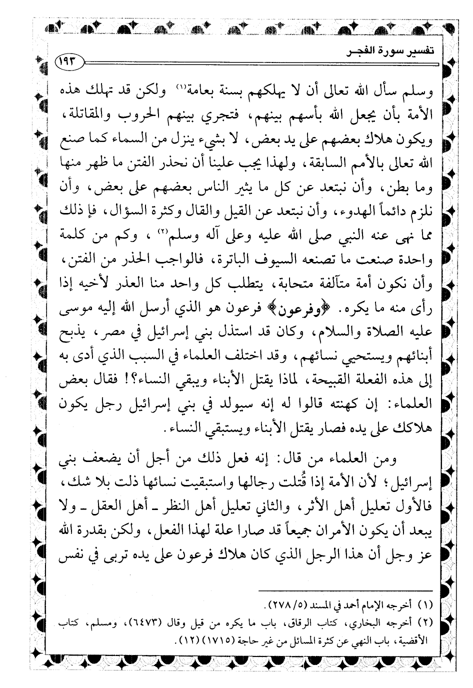 وكم من كلمة واحدة صنعت ما تصنعه السيوف الباترة، فالواجب الحذر من الفتن، وأن نكون أمة متآلفة متحابة، يتطلب كل واحد منا العذر لأخيه إذا رأى منه ما يكره. {وفرعون} فرعون هو الذي أرسل الله إليه موسى عليه الصلاة والسلام، وكان قد استذل بني إسرائيل في مصر، يذبح أبنائهم ويستحيي نسائهم، وقد اختلف العلماء في السبب الذي أدى به إلى هذه الفعلة القبيحة، لماذا يقتل الأبناء ويبقي النساء؟! فقال بعض العلماء: إن كهنته قالوا له إنه سيولد في بني إسرائيل رجل يكون هلاكك على يده فصار يقتل الأبناء ويستبقي النساء.
